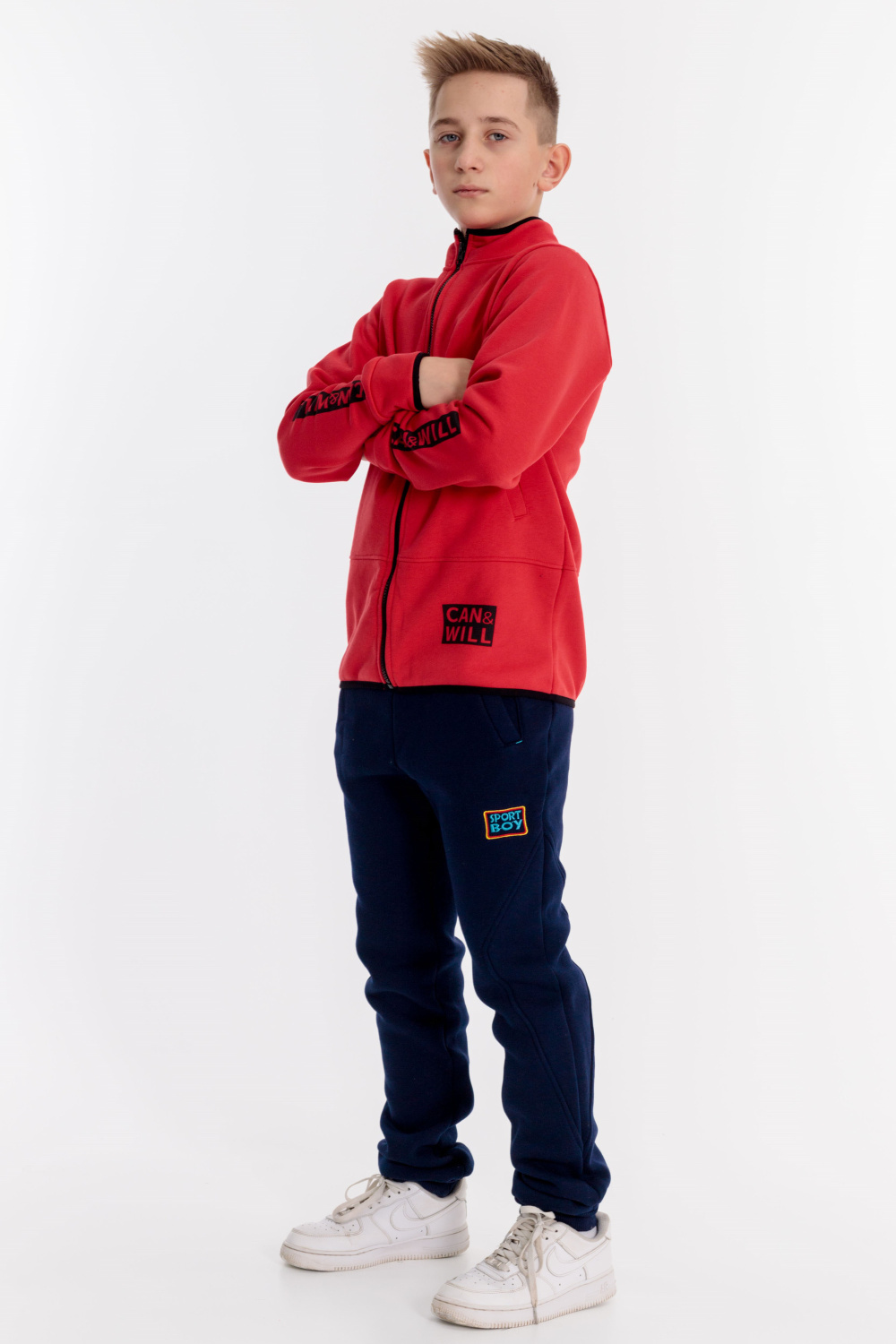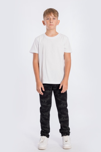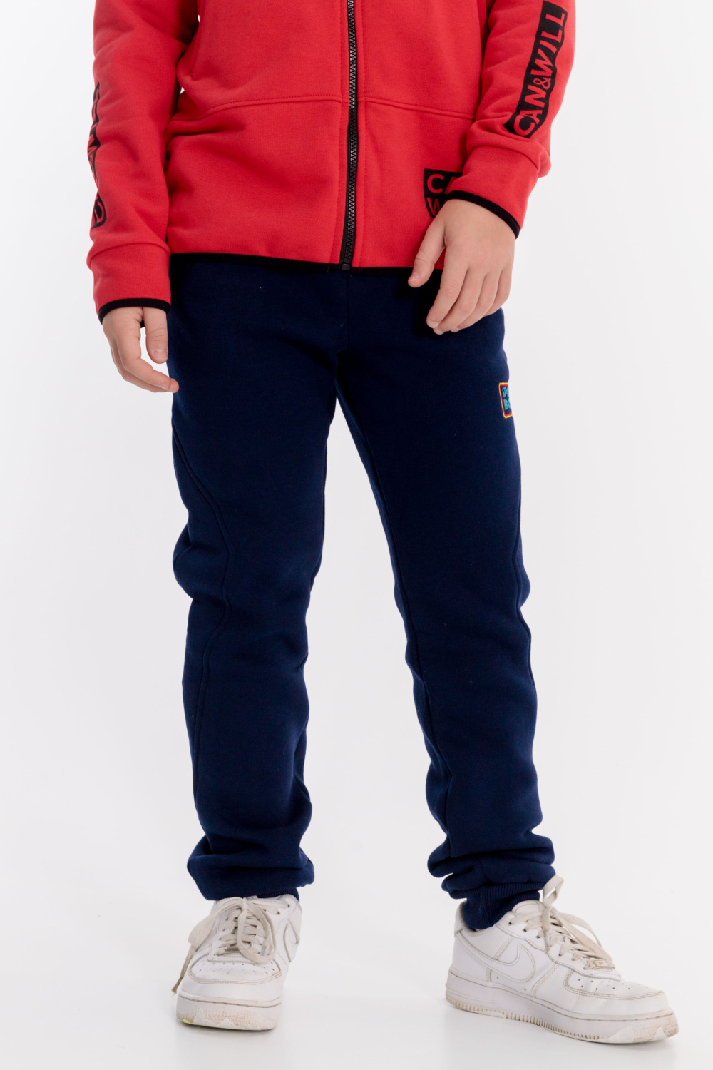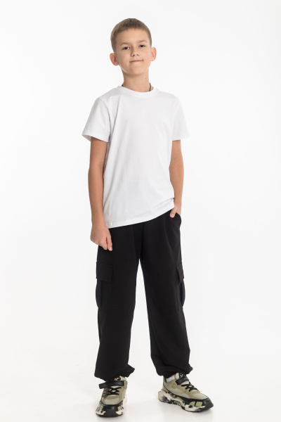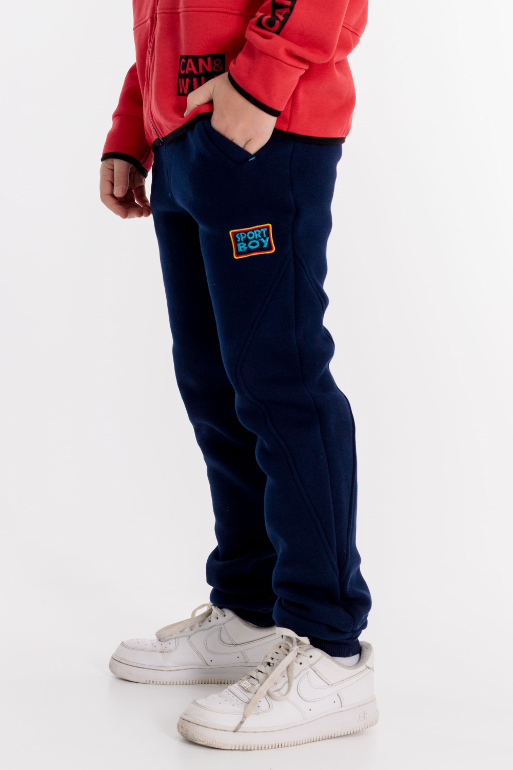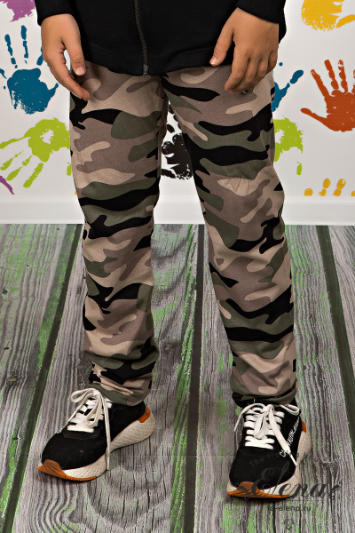 Брюки выполнены из полотна с начёсом. С притачным поясом и манжетами из кашкорсе. Пояс с широкой резиной, через люверсы проложен шнур. Покрой брюк с отделочными уголками, которые образуют ромб по бокам брючин. По бокам размещены наклонные, прорезные карманы, с левой стороны вышивка.