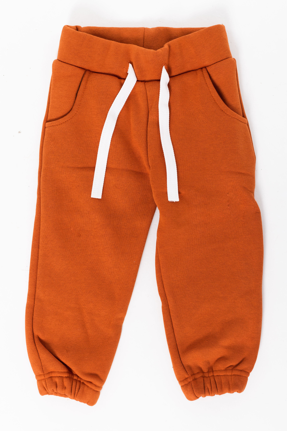 Тёплые, детские брюки выполнены из полотна с начёсом. По бокам расположены карманы, а для комфортной посадки в пояс вставлены шнур и резина. Низ брюк на резине.