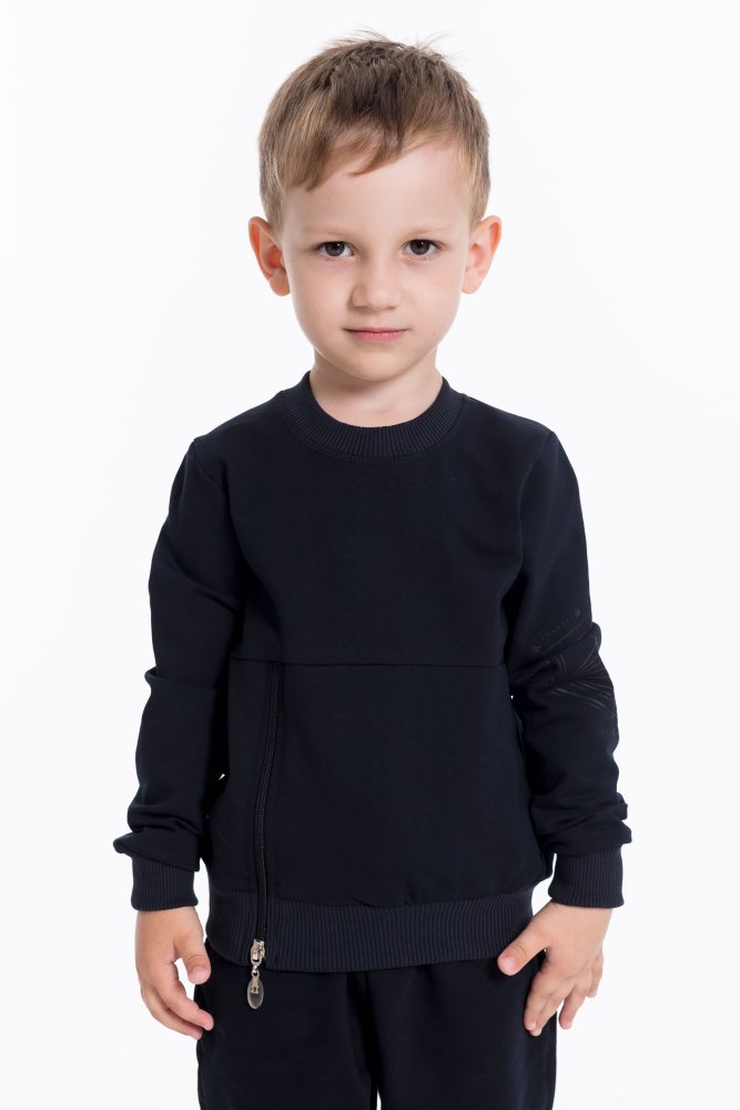 Джемпер из футер петли с принтом на рукаве. Горловина, низ рукавов и пояс изделия из кашкорсе. Спереди в качестве отделки замок и принт.