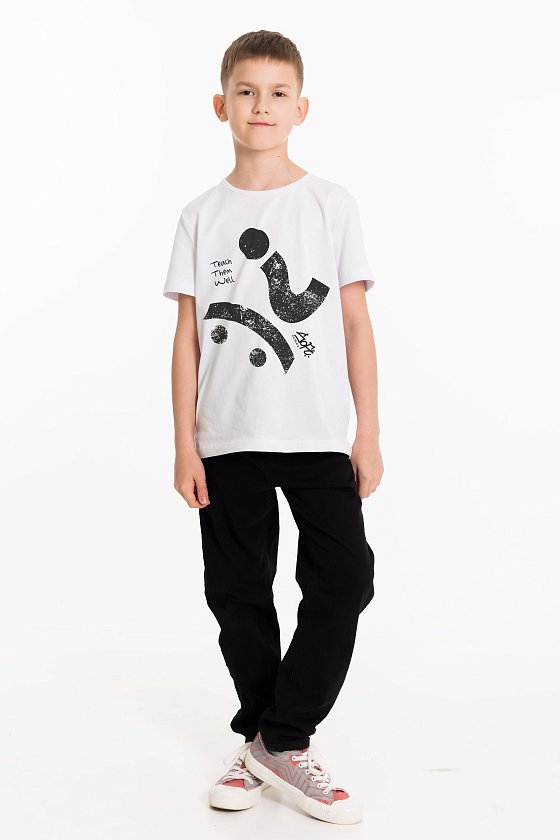 Футболка детская из кулирки с круглым вырезом горловины и принтом спереди.