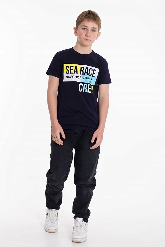 Футболка для мальчиков из хлопка с добавлением лайкры. Круглый вырез горловины, втачной рукав, принт на полочке.