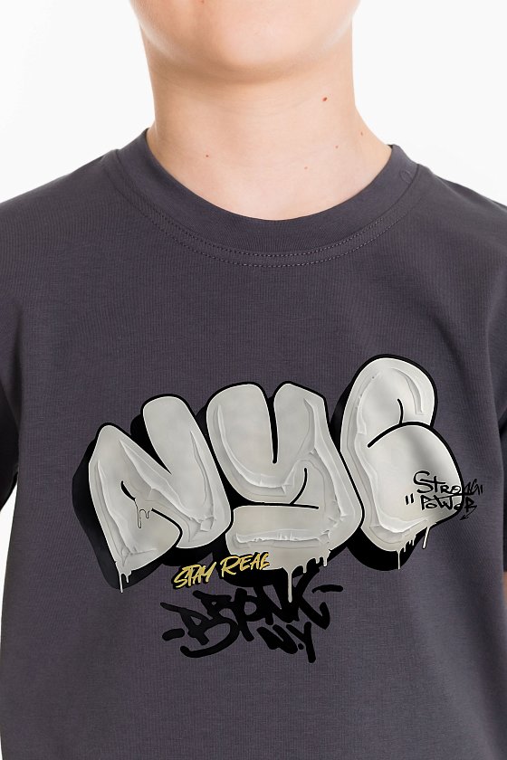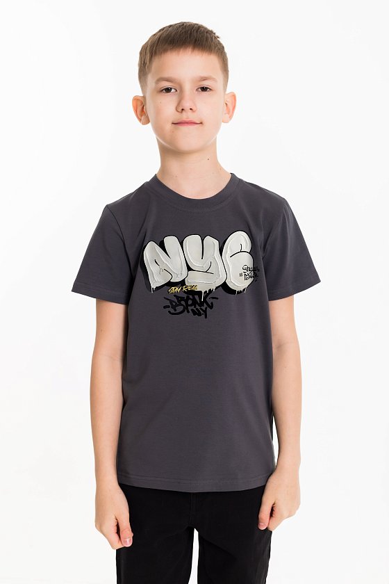 Футболка детская выполнена из кулирки с лайкрой. Футболка с круглым вырезом горловины и принтом спереди.