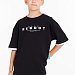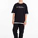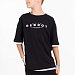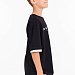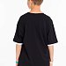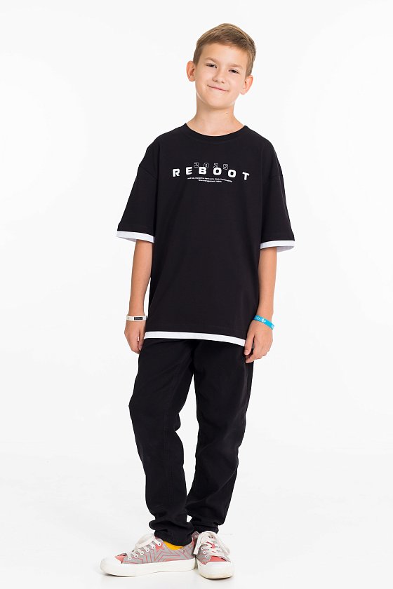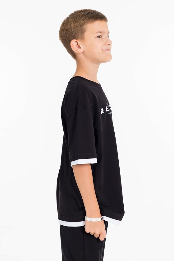 Футболка оверсайз силуэта с отделочными белыми вставками выполнена из кулирки. Линия плеча спущена, спереди нанесён принт.