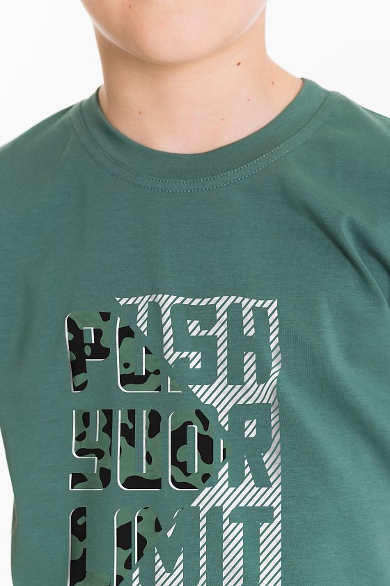 Футболка выполнена из хлопкового полотна с добавлением лайкры. Футболка с круглым вырезом горловины и принтом спереди.