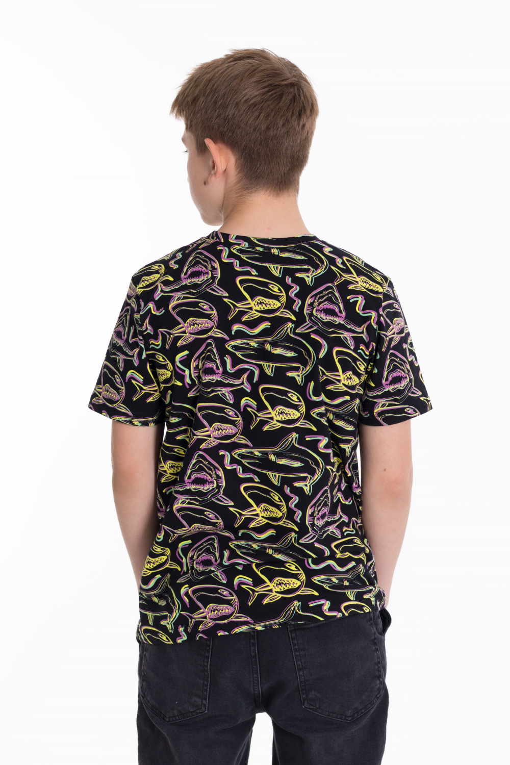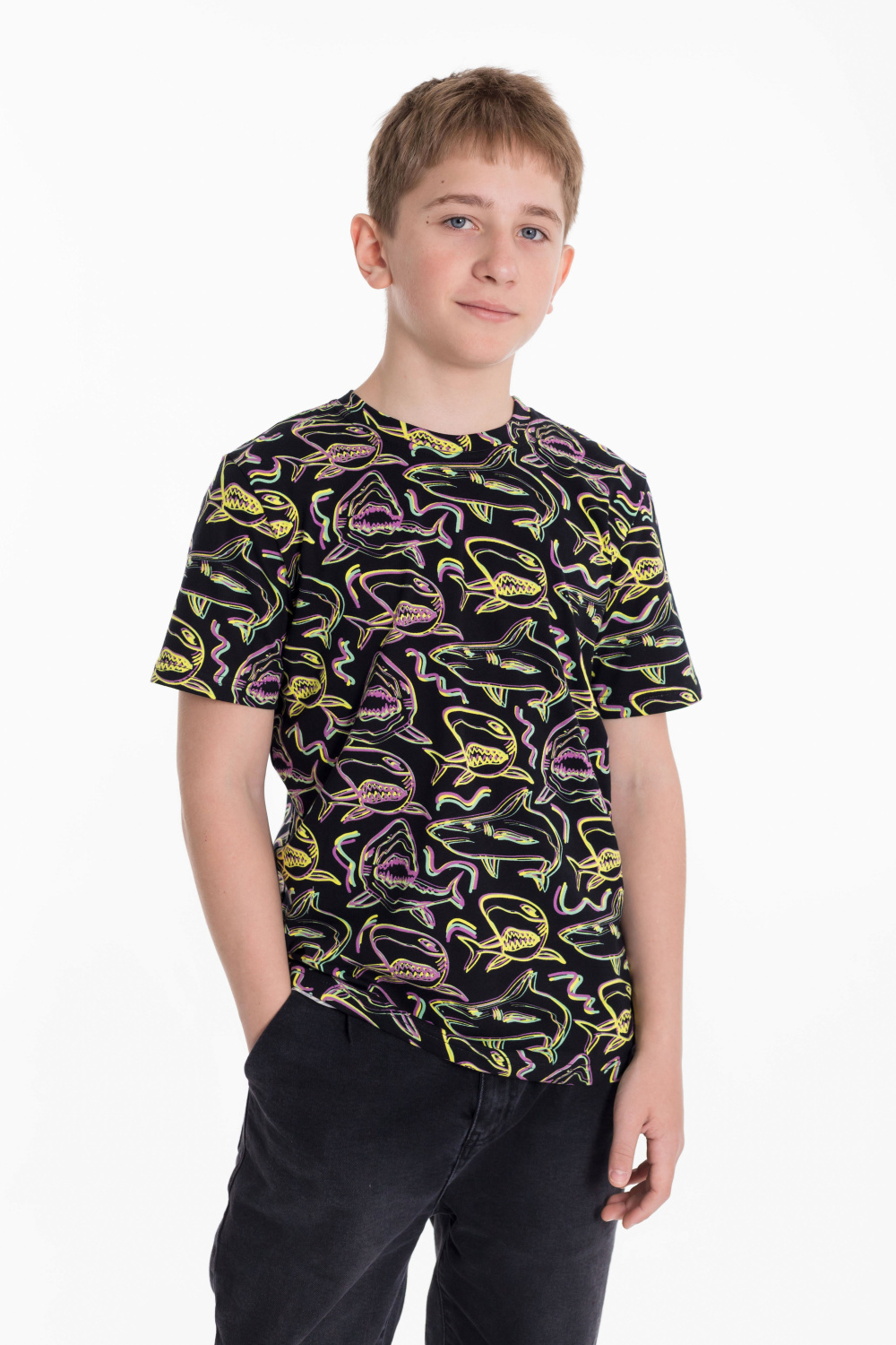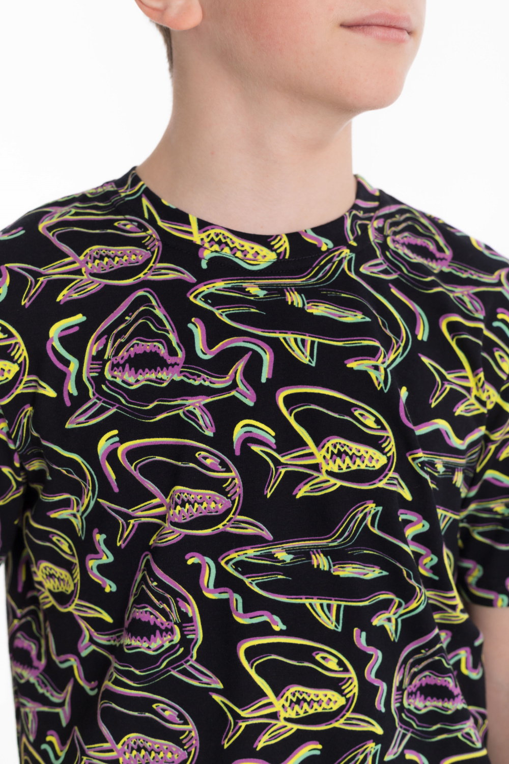 Футболка из кулирки с лайкрой. С коротким рукавом и круглым вырезом горловины.