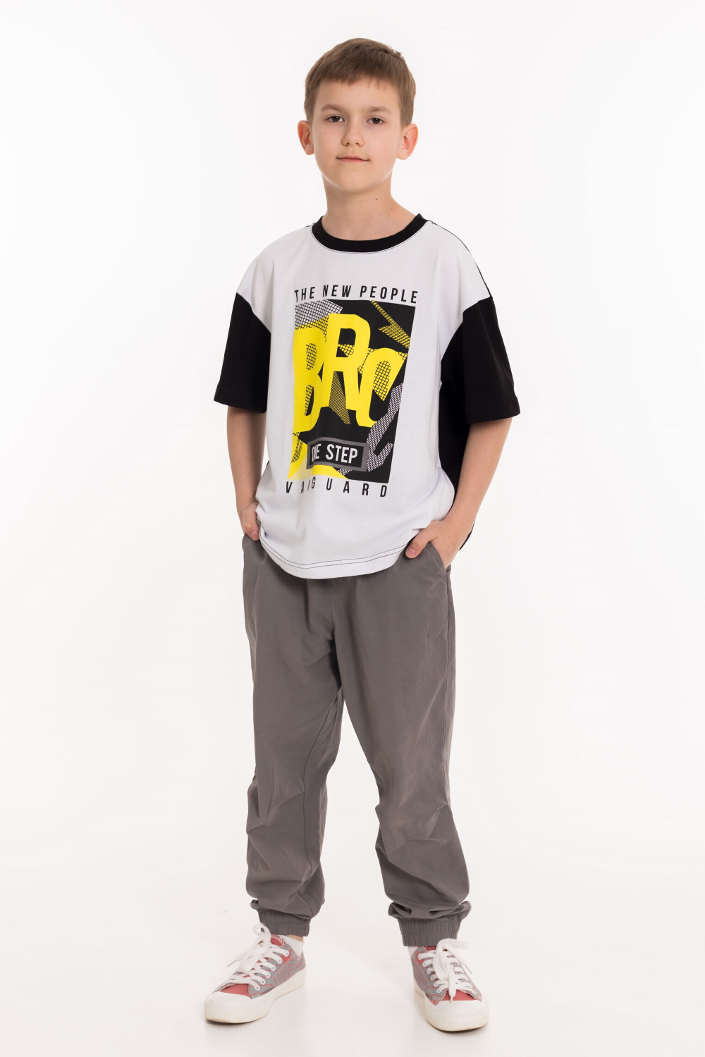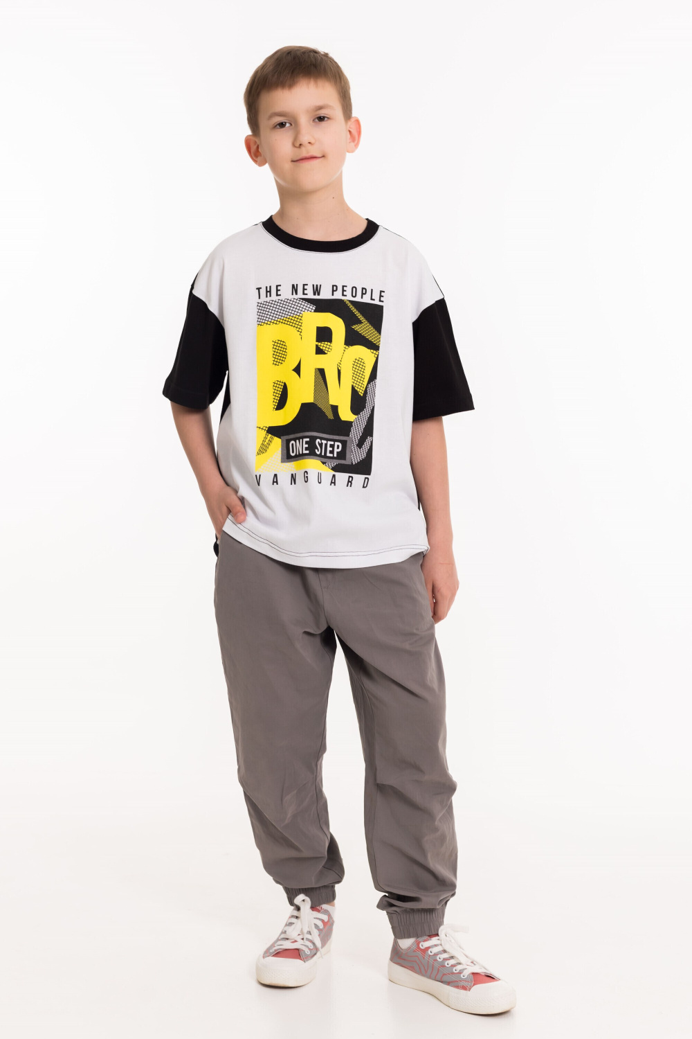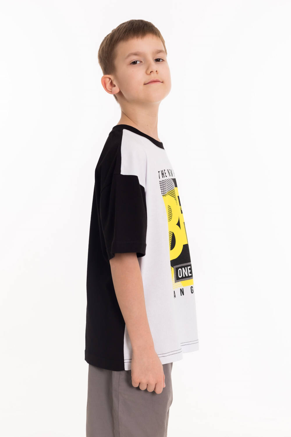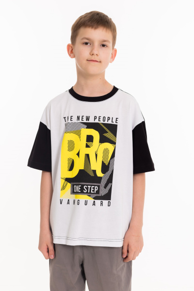 Футболка выполнена из кулирки. Свободный покрой, с коротким спущенным рукавом. Круглая горловина оформлена притачной планкой. Спереди нанесён принт.