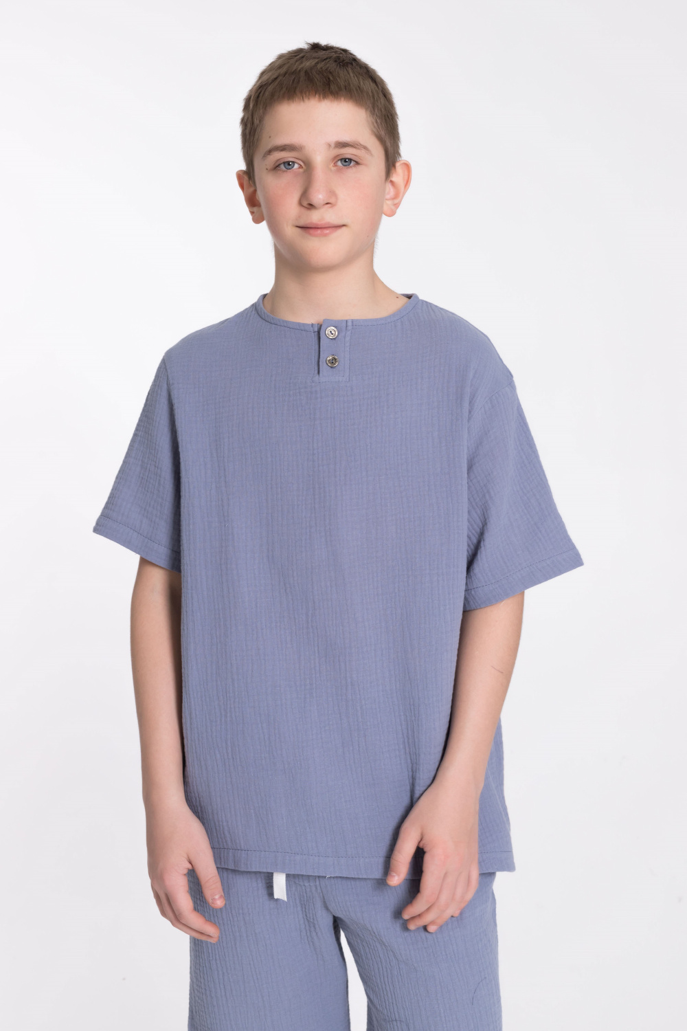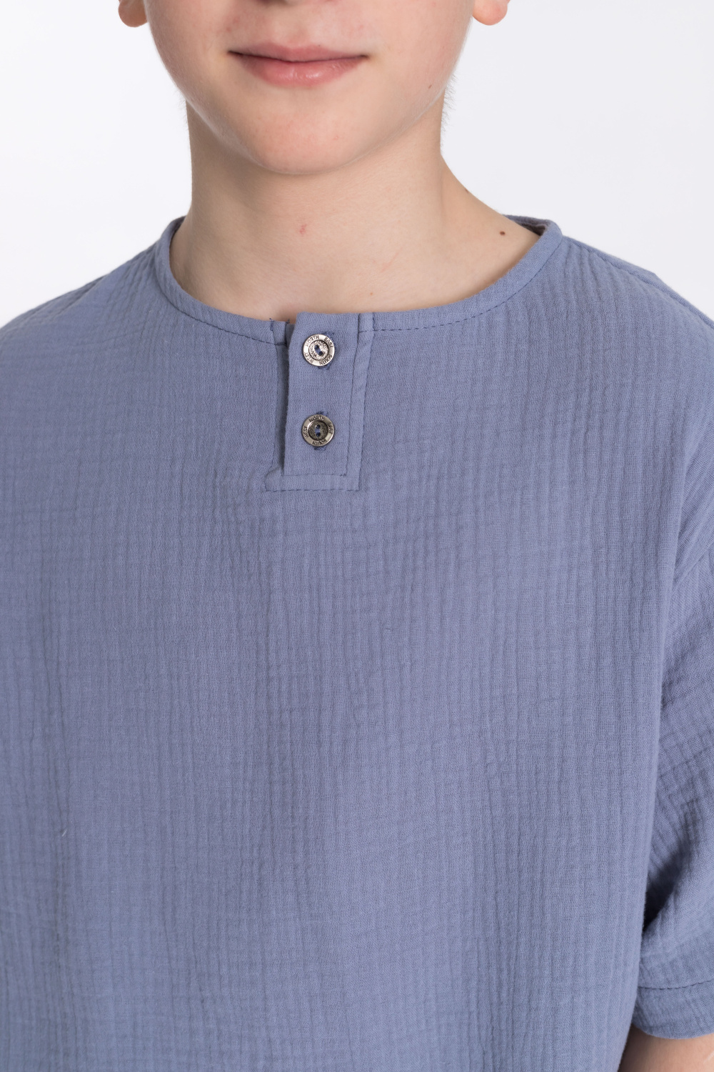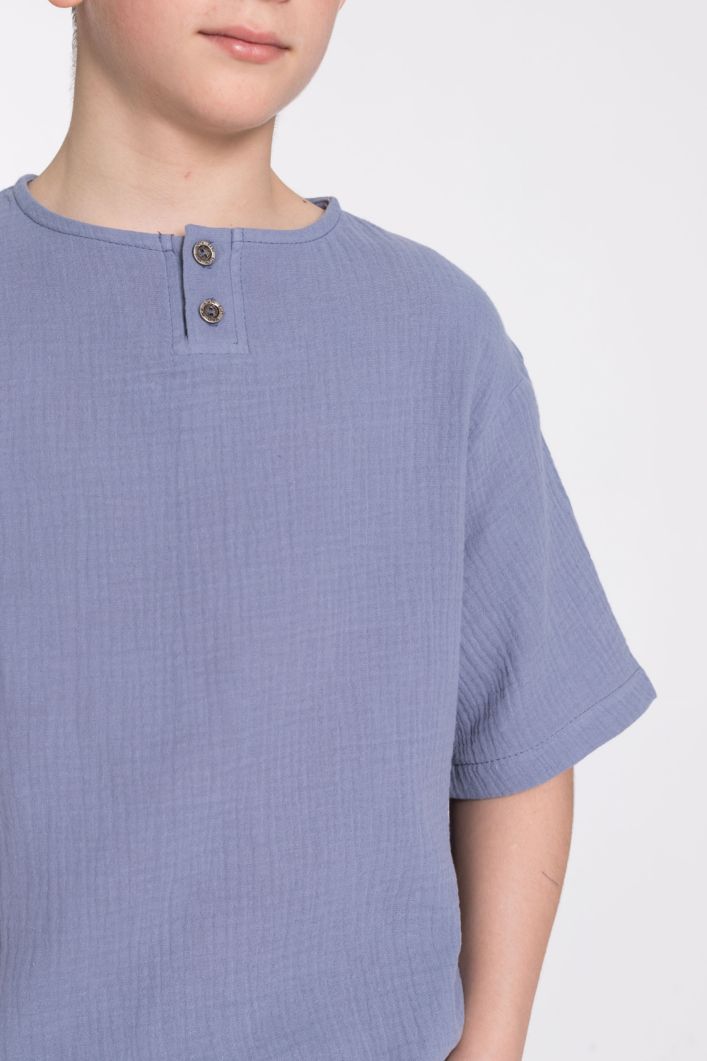 Футболка выполнена из хлопкового полотна - муслина. Силуэт  свободный, круглый вырез горловины украшен двумя пуговицами.