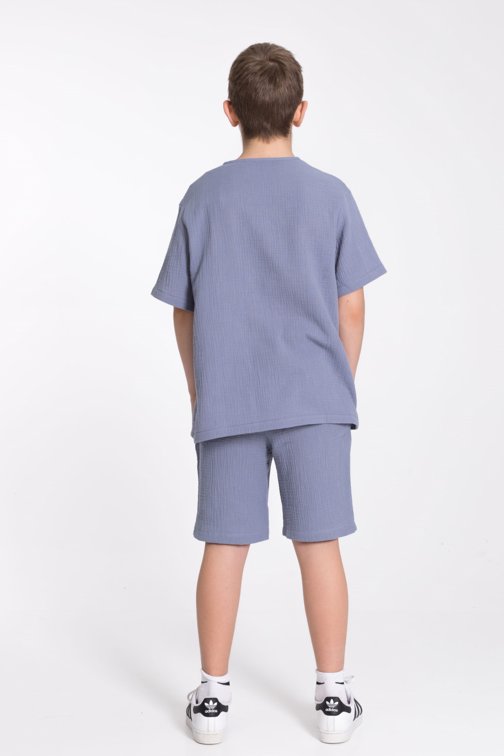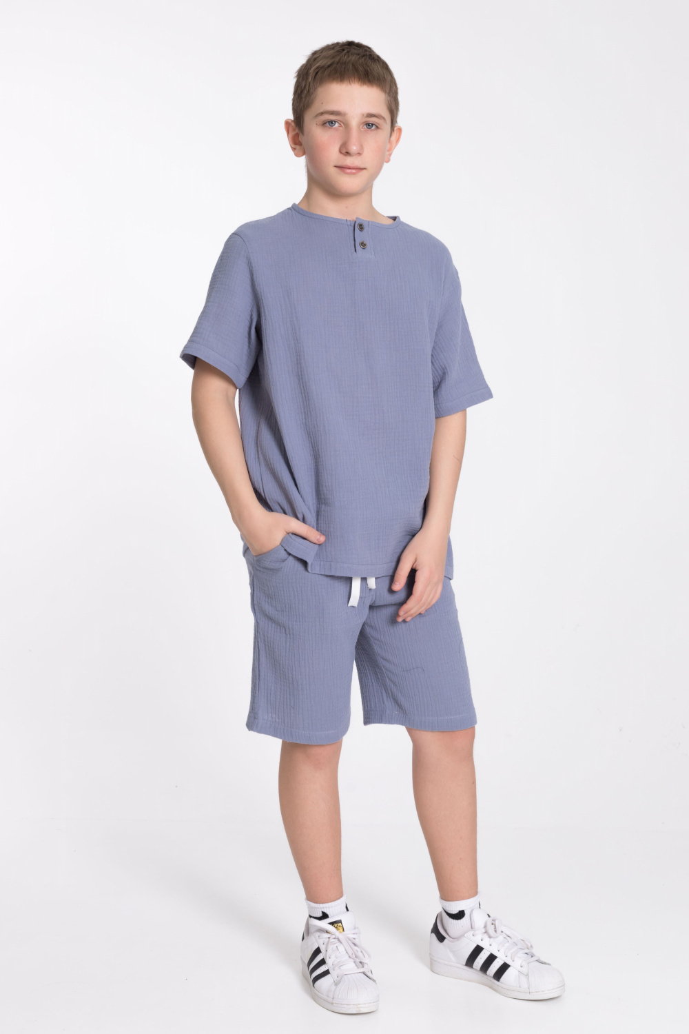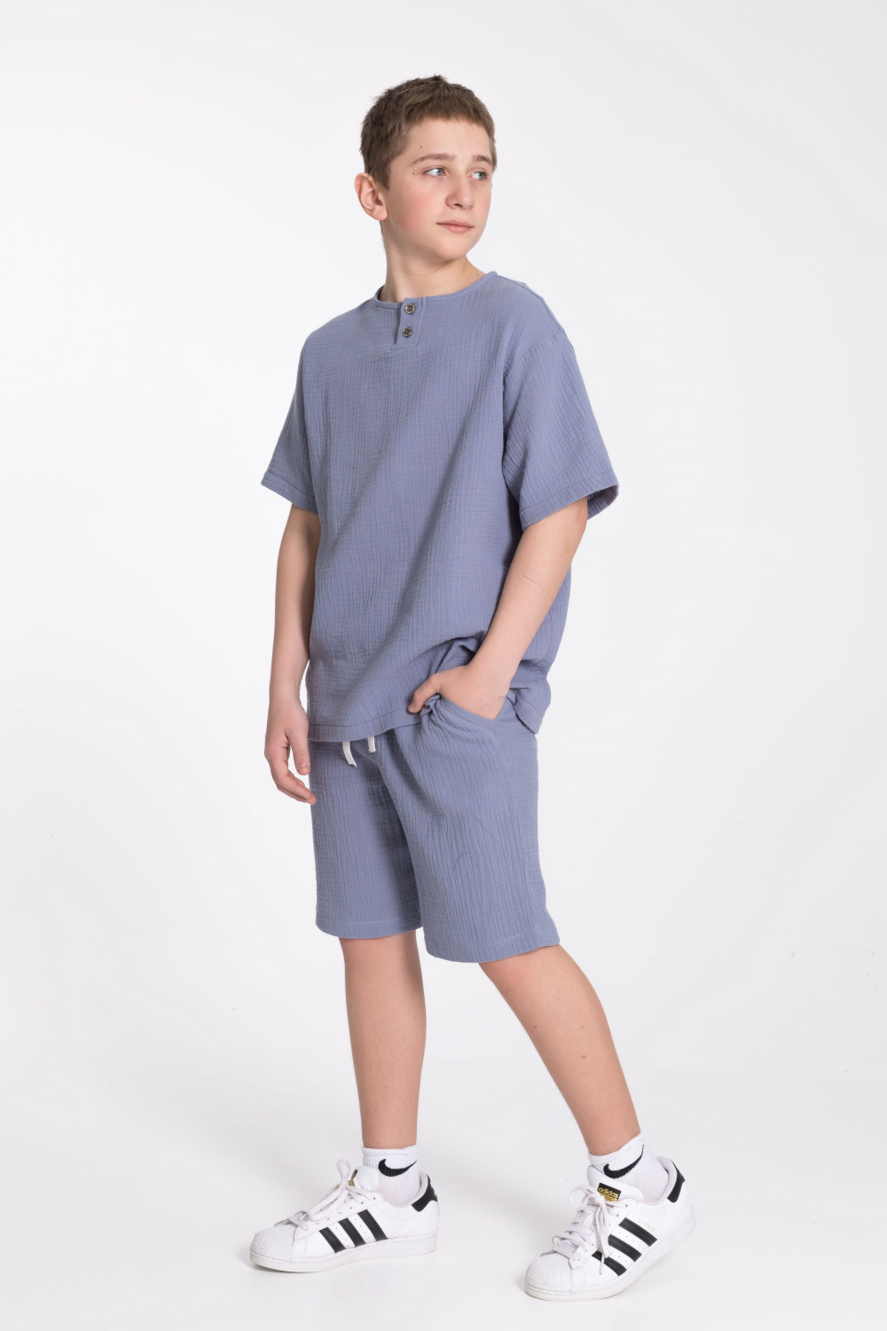 Футболка выполнена из хлопкового полотна - муслина. Силуэт  свободный, круглый вырез горловины украшен двумя пуговицами.