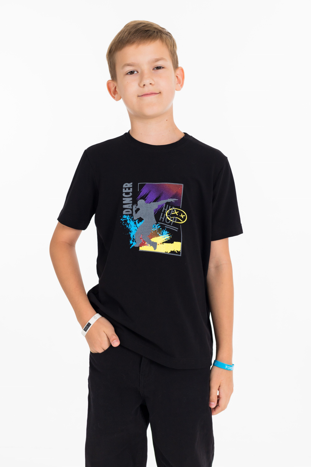 Футболка выполнена из хлопкового полотна с добавлением лайкры. Футболка с круглым вырезом горловины и принтом спереди.