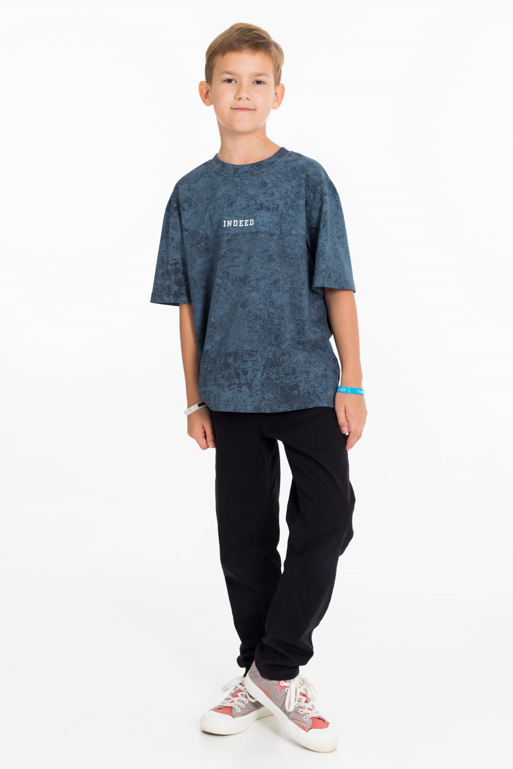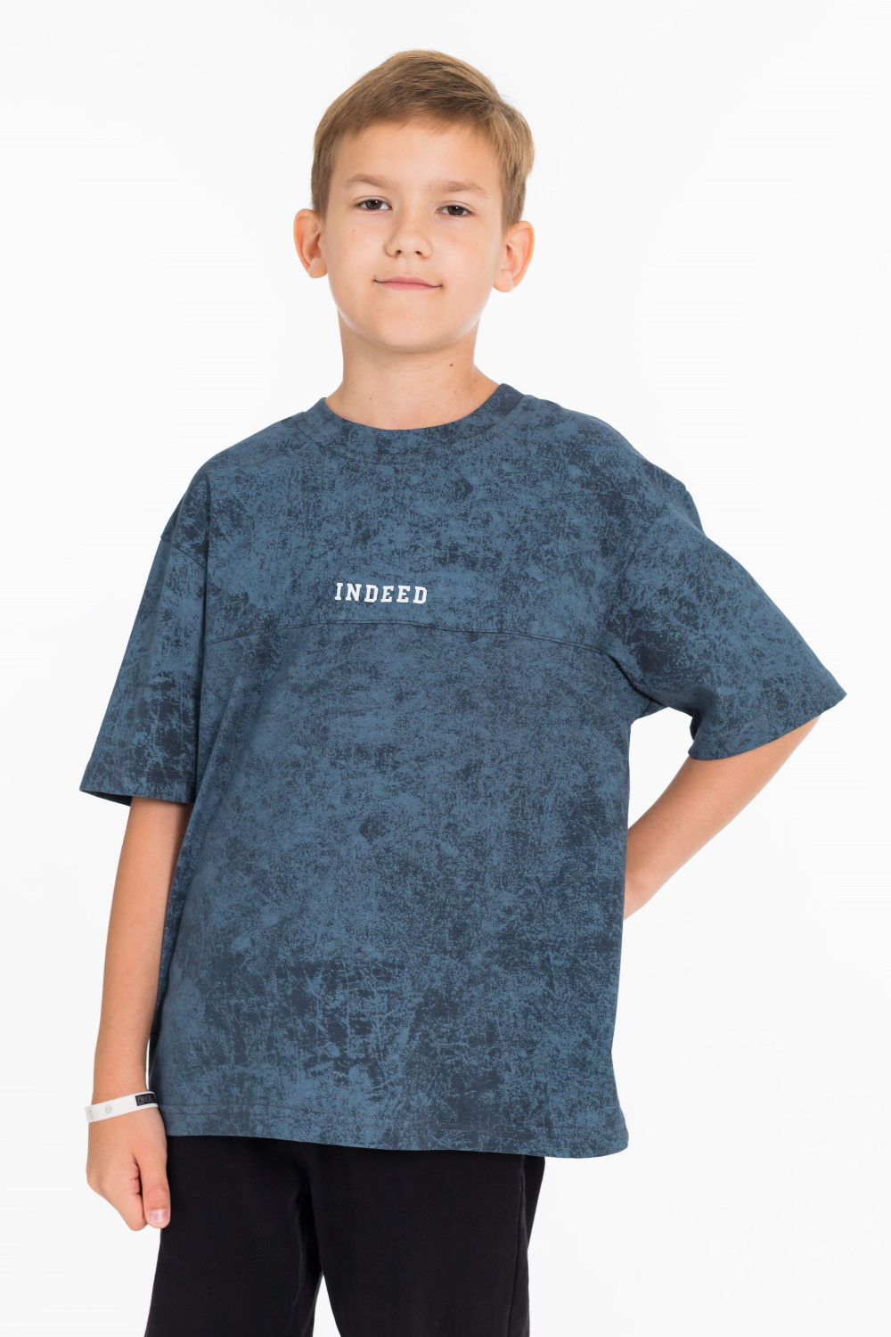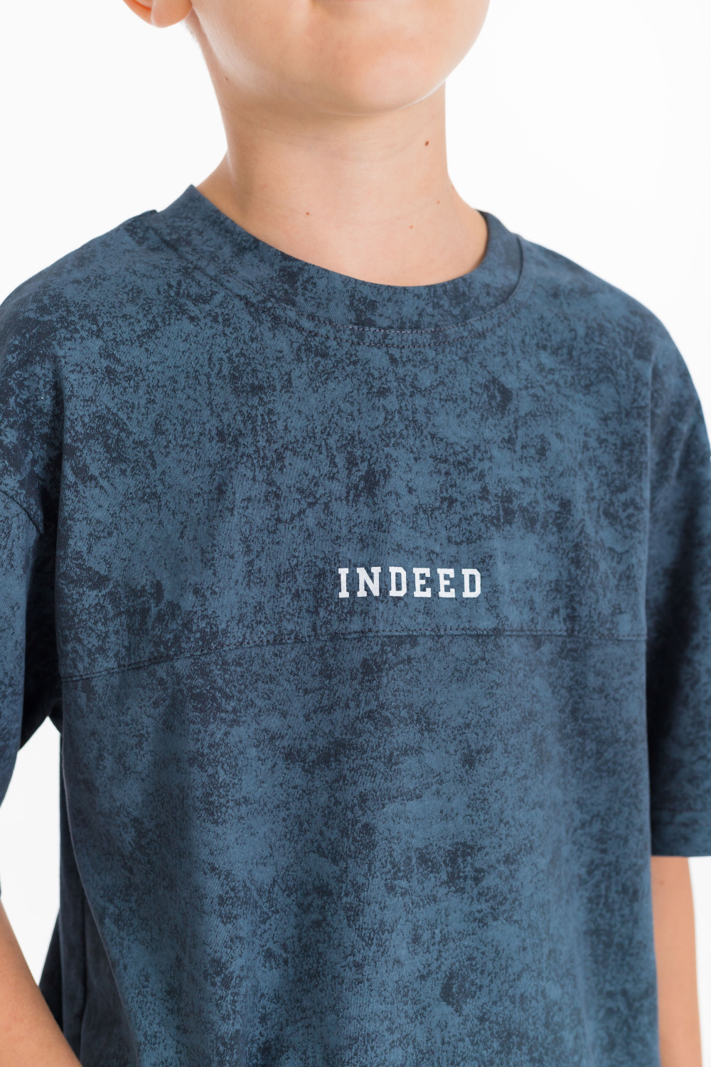 Футболка оверсайз силуэта выполнена из кулирки. Линия плеча спущена, спереди кокетка с отстрочкой и принтом.