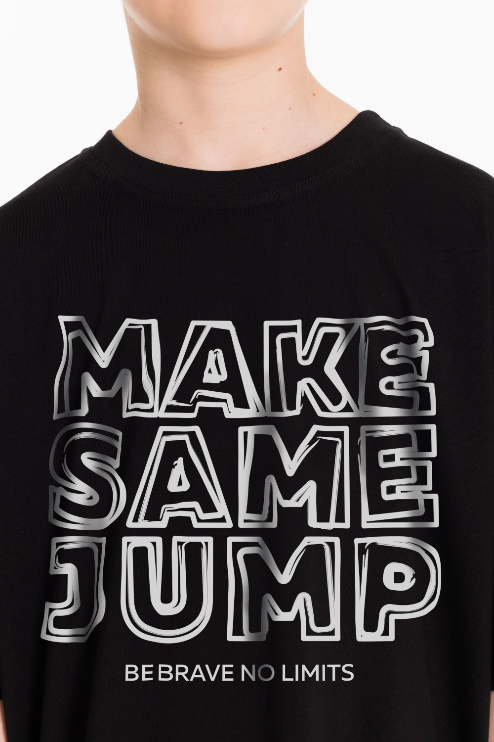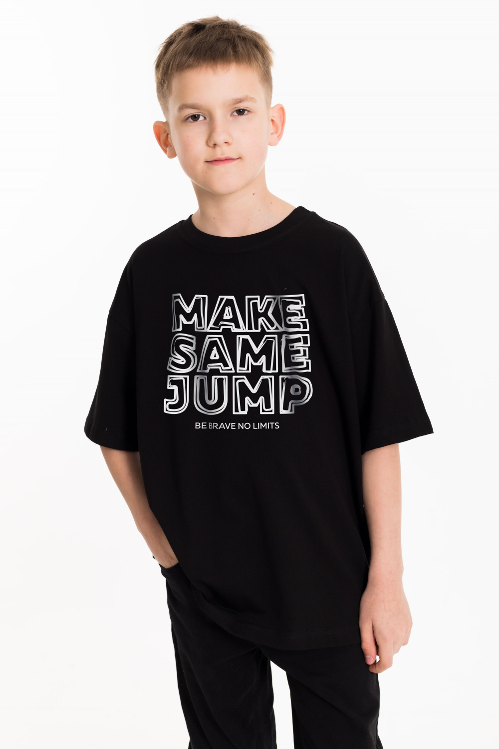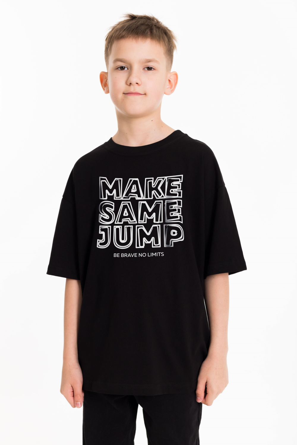 Футболка оверсайз из однотонной кулирки, 100% хлопок. С коротким рукавом и круглым вырезом горловины. Спереди нанесён принт.
