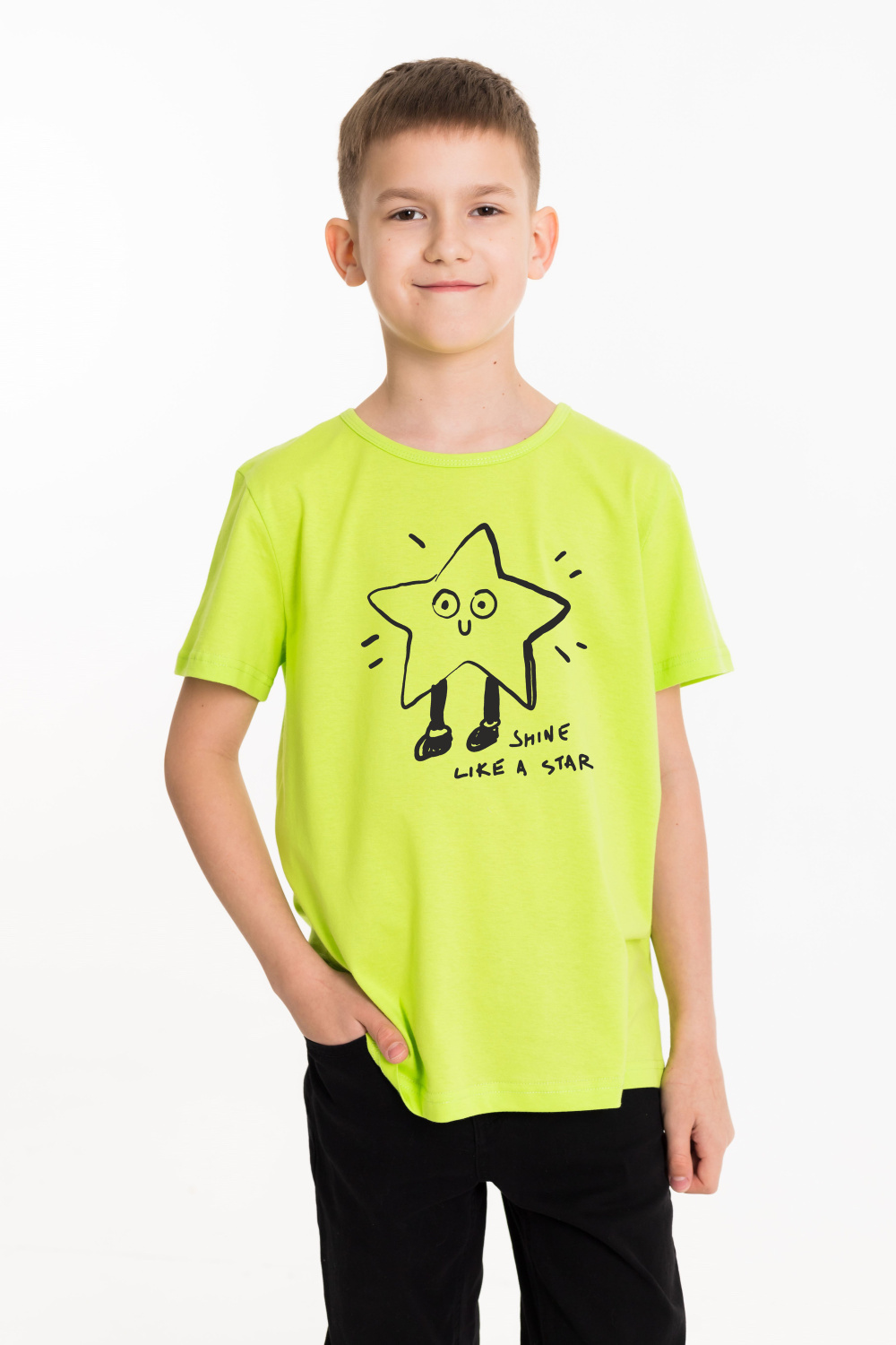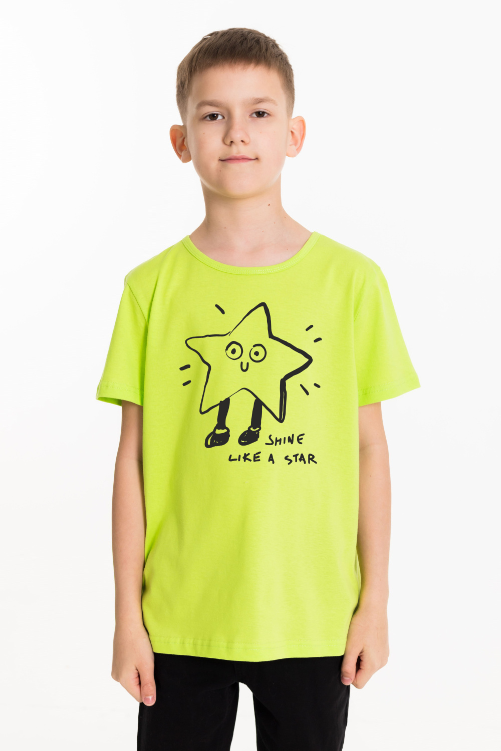 Футболка выполнена из хлопкового полотна. Футболка с круглым вырезом горловины и принтом спереди.