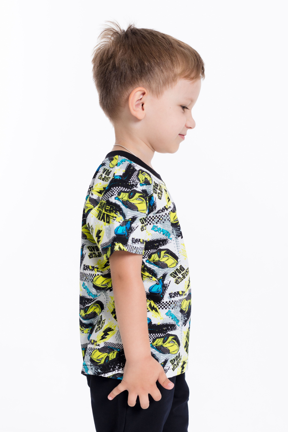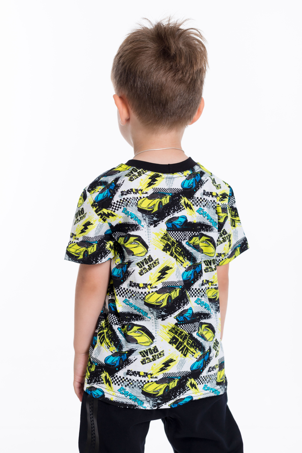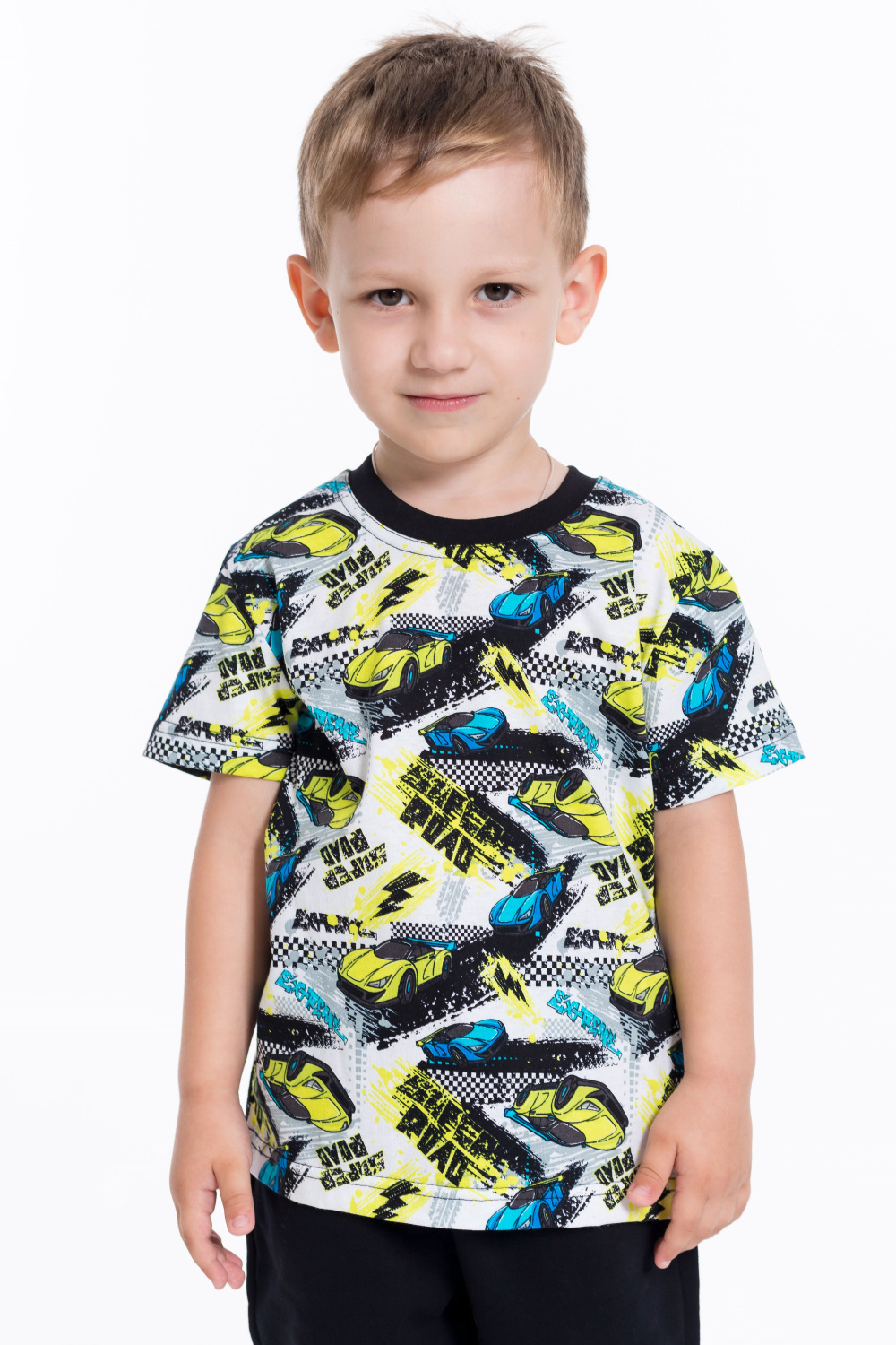 Футболка выполнена из хлопкового полотна c набивным рисунком, с коротким рукавом и круглым вырезом горловины.