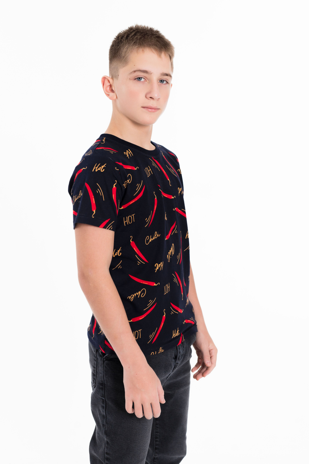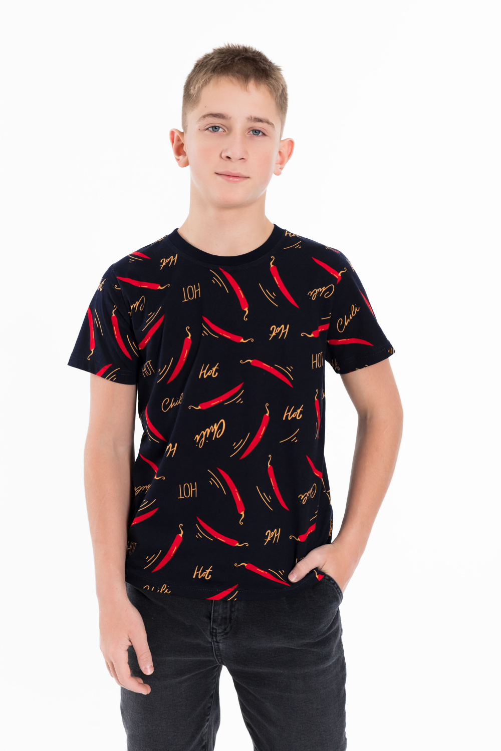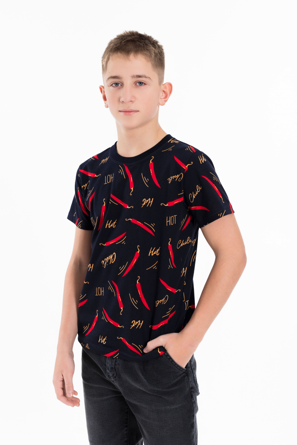 Футболка выполнена из хлопкового полотна c набивным рисунком, с коротким рукавом и круглым вырезом горловины.