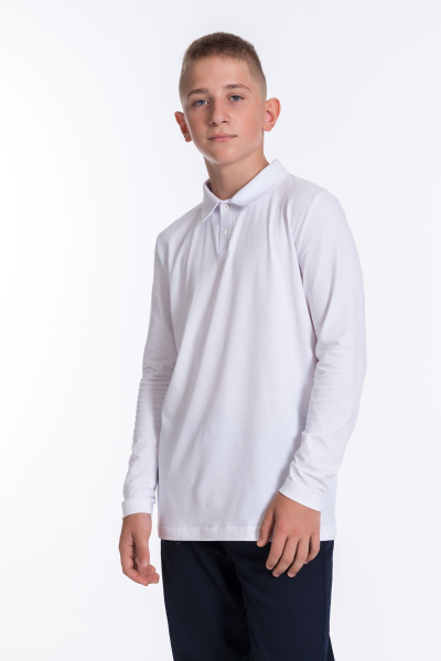 Белая футболка-поло с длинным рукавом из материала кулирка с лайкрой и застёжкой на две пуговицы — отличный выбор для школьника. Обеспечивает свободу движений, комфорт и аккуратный внешний вид. Воротник придаёт изделию стильный вид.