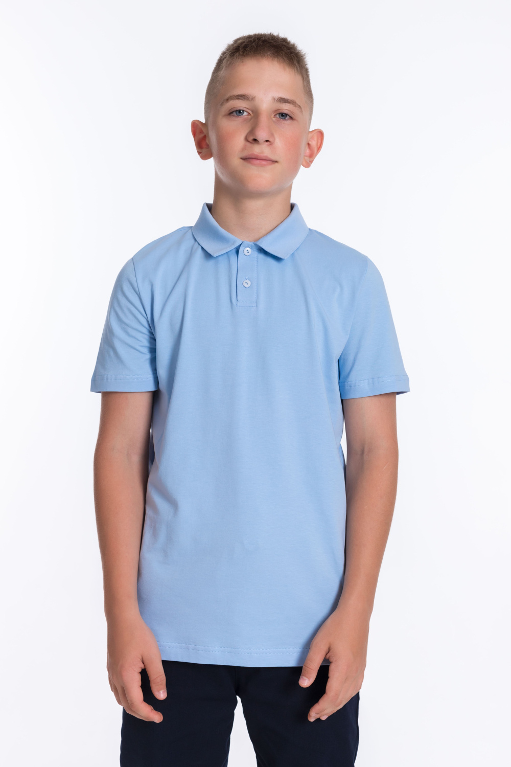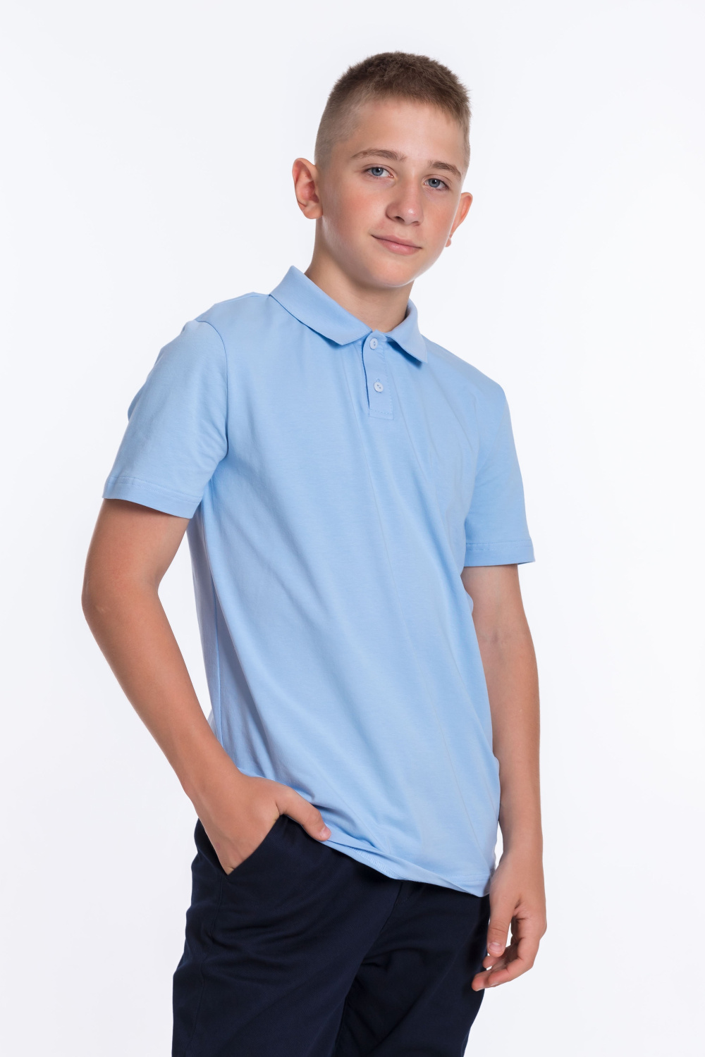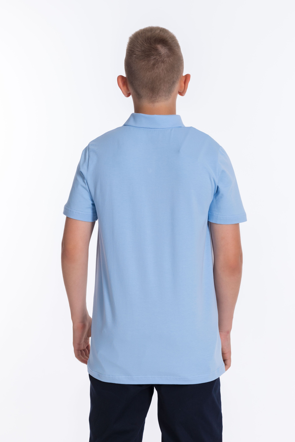 Голубая футболка-поло для мальчика с коротким рукавом из материала кулирка с лайкрой и застёжкой на две пуговицы — отличный выбор для школьника. Воротник придаёт изделию аккуратный вид, а качественный материал обеспечивает комфорт при носке.