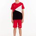 Костюм выполнен из хлопкового полотна, состоит из футболки и шорт. Футболка прямого силуэта, круглый вырез горловины оформлен бейкой, рукав короткий. С левой стороны нанесён принт. Шорты с принтом, поясом на резинке и карманами по бокам.