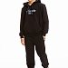 Костюм выполнен из футера с лайкрой. Толстовка с капюшоном, карманом-кенгуру, притачным поясом и манжетами из кашкорсе. Спереди на толстовке нанесён принт. Брюки с поясом на резине и шнуре, манжетами из основного полотна и карманами на молнии по бокам.