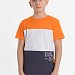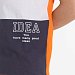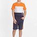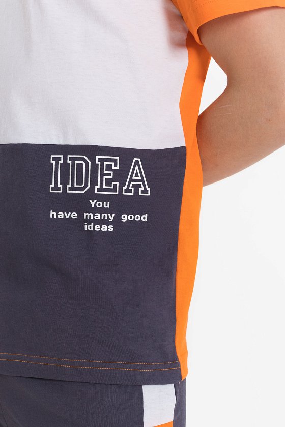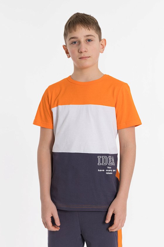 Футболка прямого силуэта с коротким рукавом, круглым вырезом под бейку из основной ткани, перед разделен на вставки контрастного цвета. На нижней части принт с левой стороны.