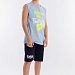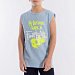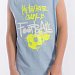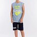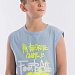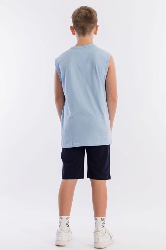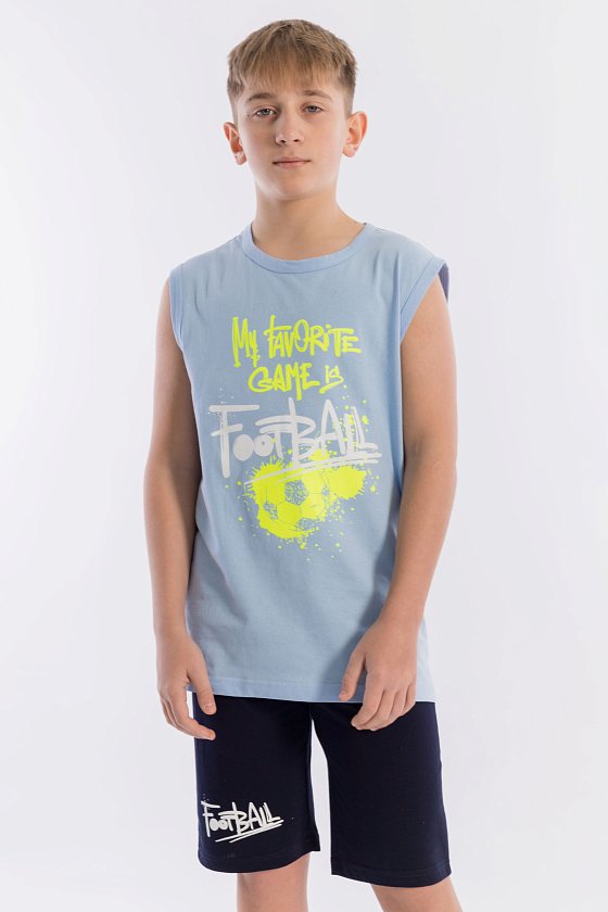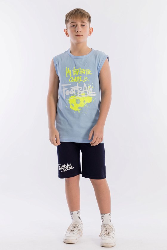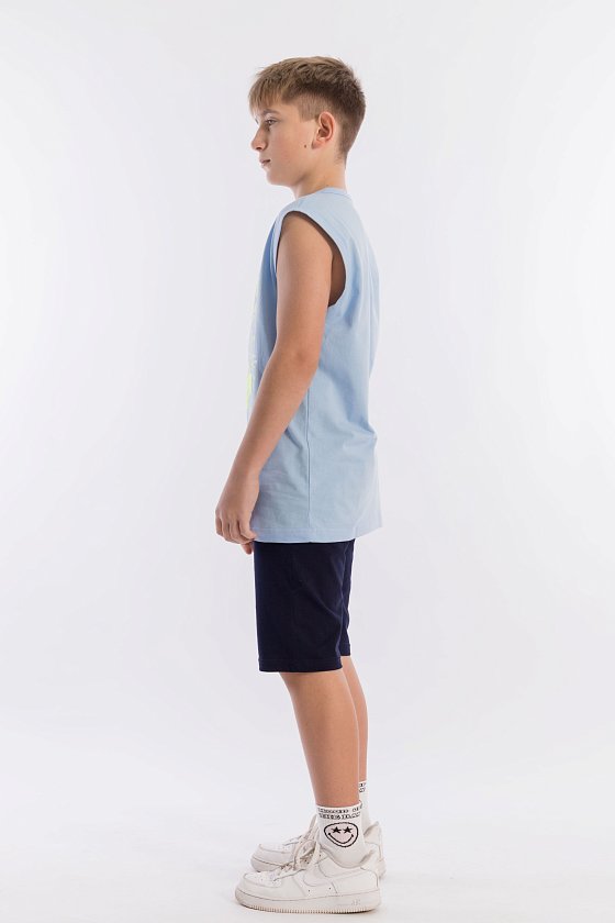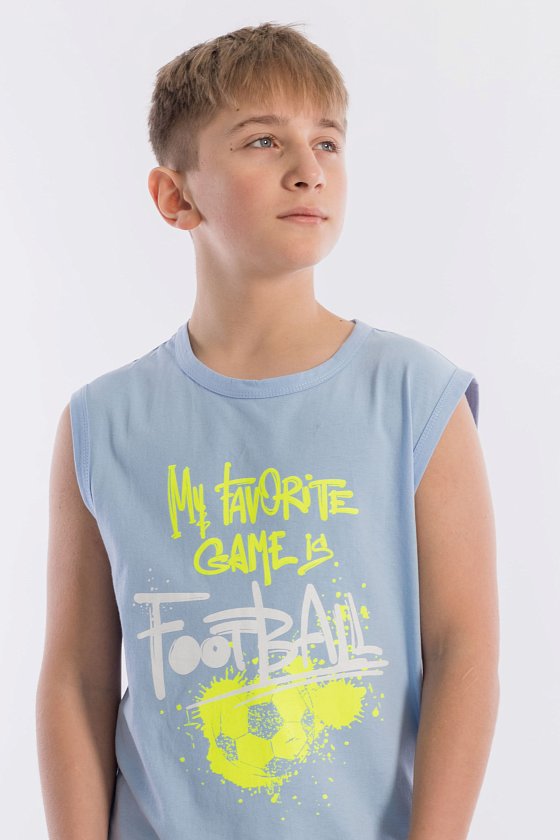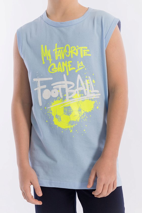 Майка однотонная, с принтом спереди, проймы и горловина обработаны бейкой.