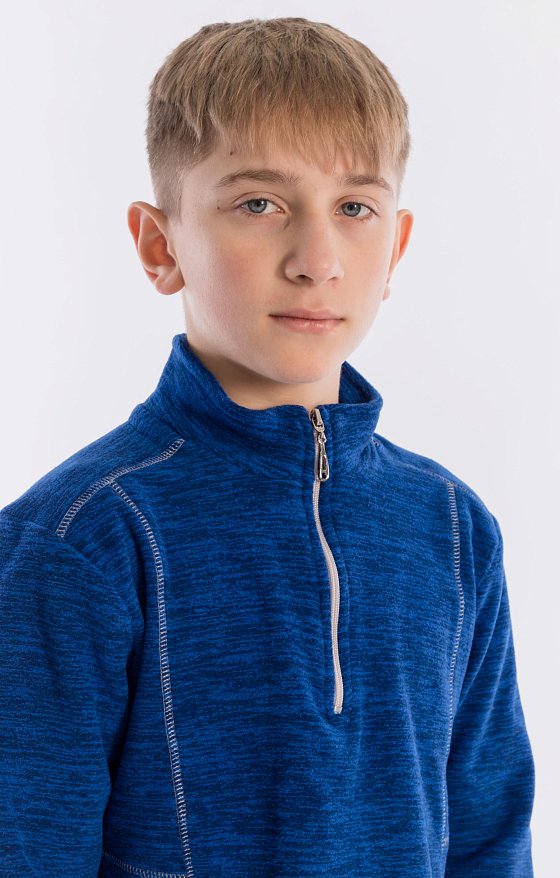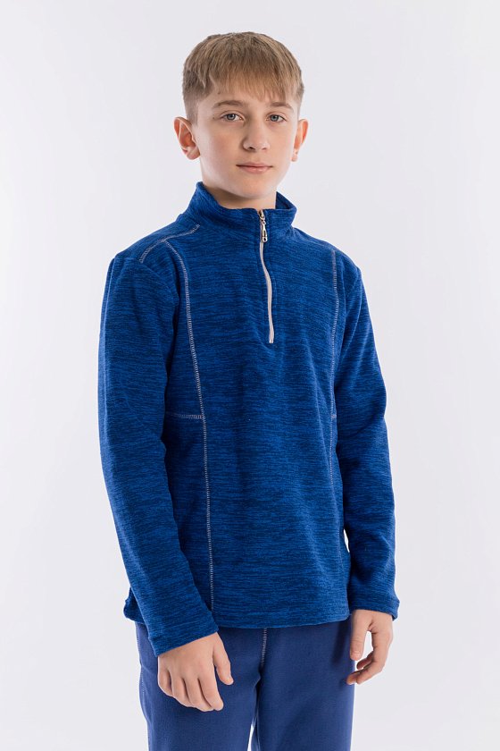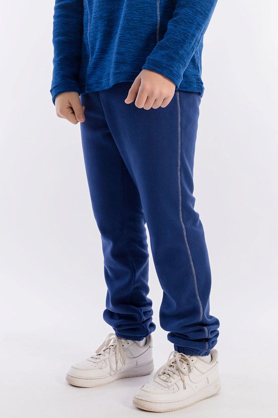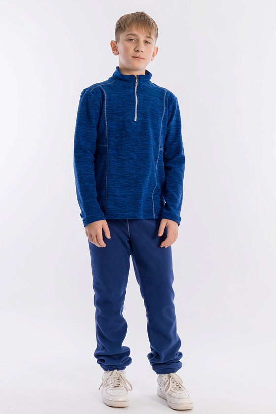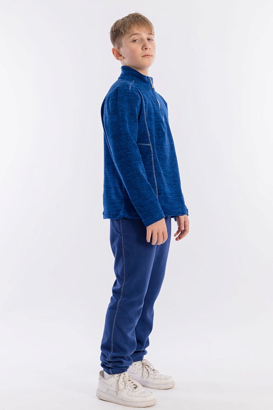 Костюм выполнен из флиса. Толстовка с воротником-стойкой с застёжкой на короткую молнию. Пояс и низ брюк на резинке. На толстовке и брюках в качестве отделки декоративная отстрочка.
