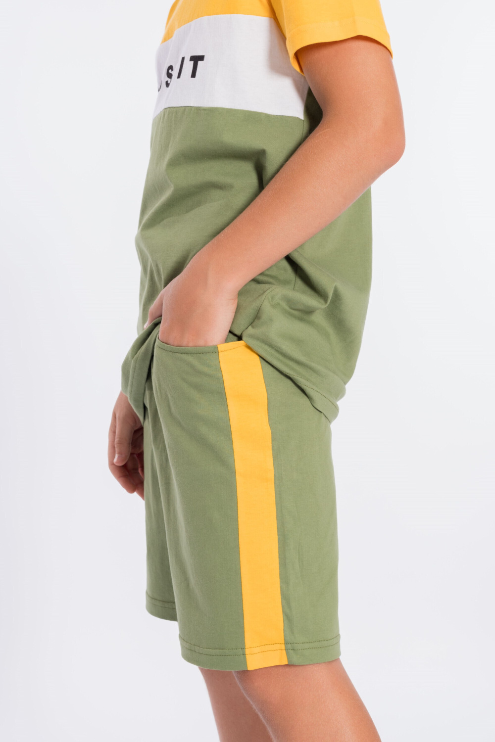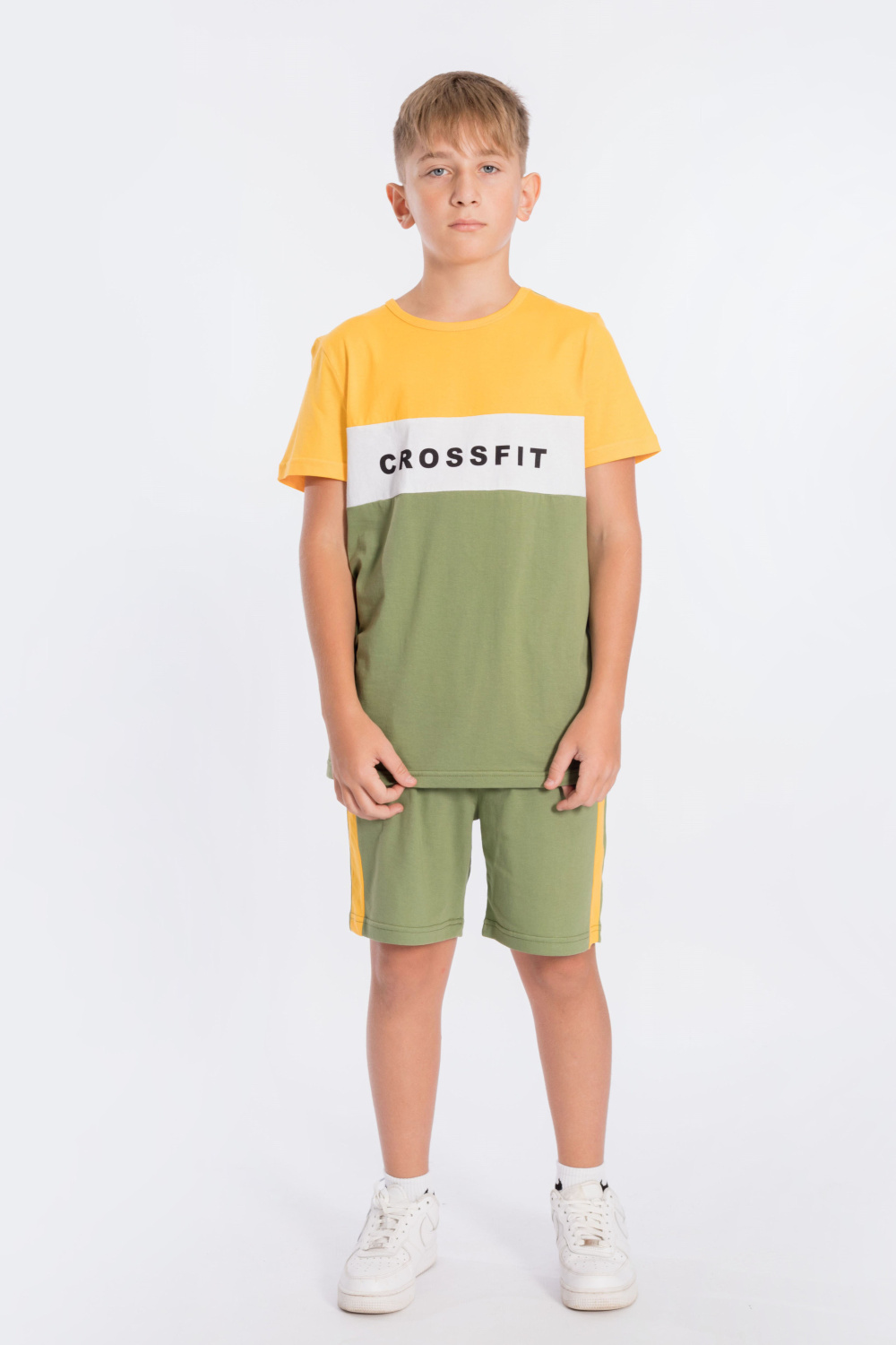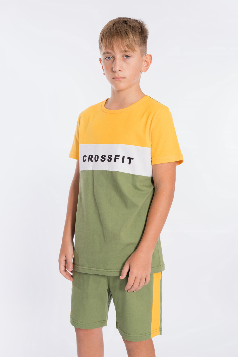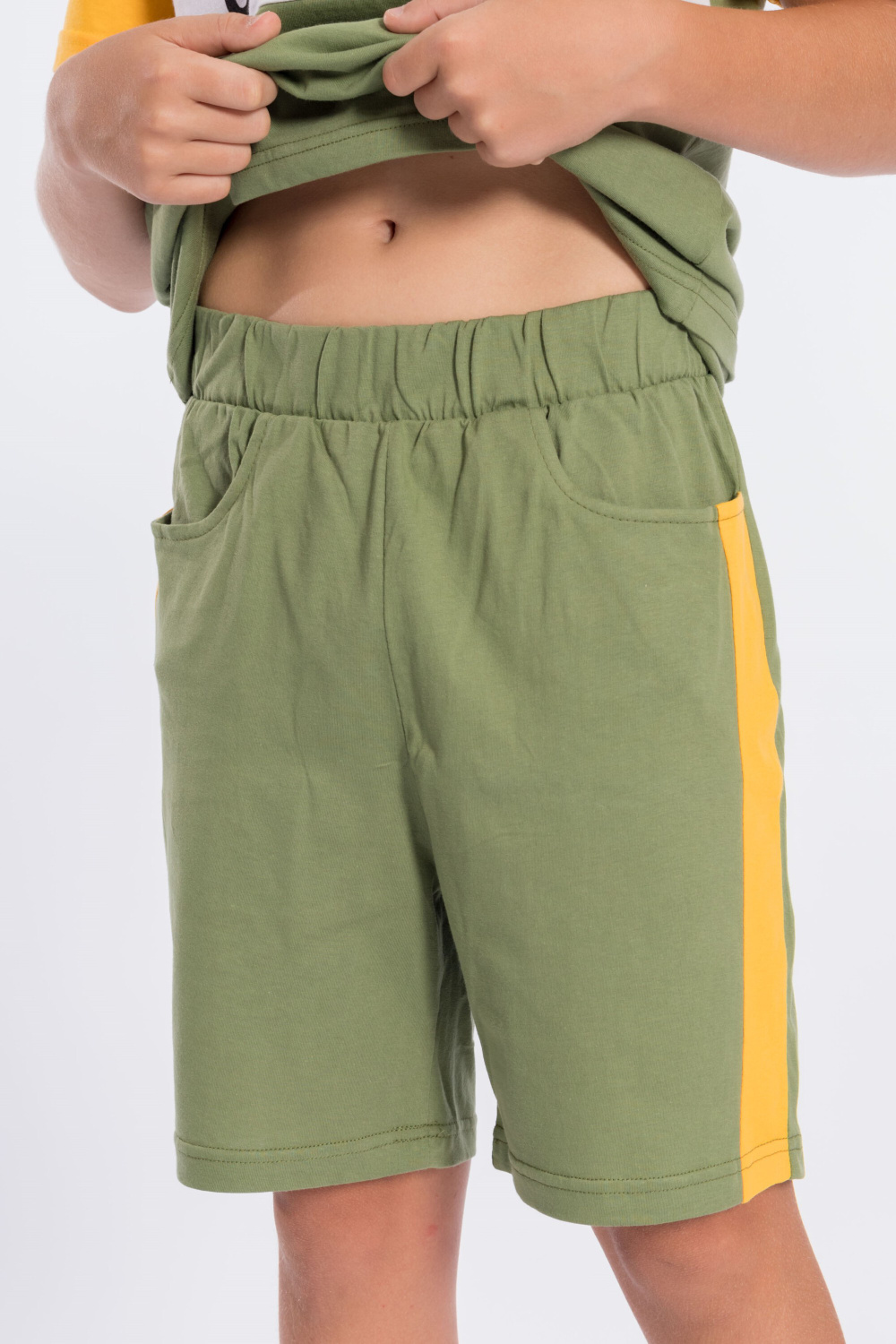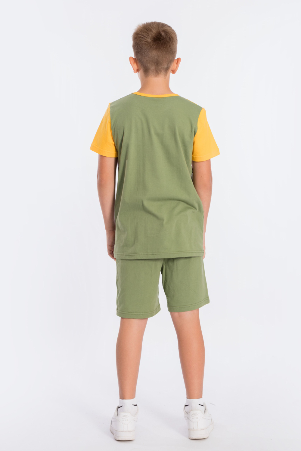 Костюм для мальчика выполнен из мягкой и приятной к телу ткани — кулирки (100% хлопок), комбинирован из трёх цветов. Он состоит из свободных шорт и футболки, что обеспечивает комфорт и свободу движений.