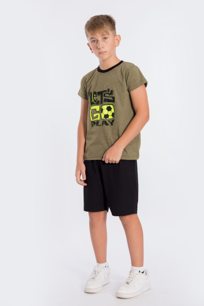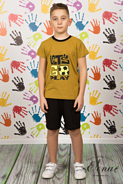 Костюм выполнен из кулирки, 100% хлопок. Футболка с принтом спереди, рукав короткий. Шорты с поясом на резинке.