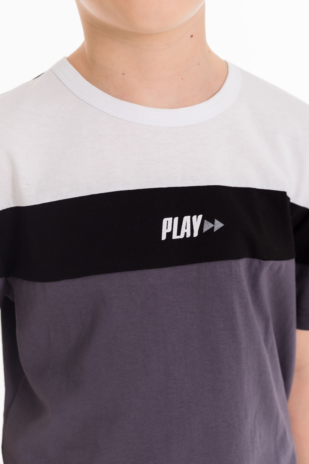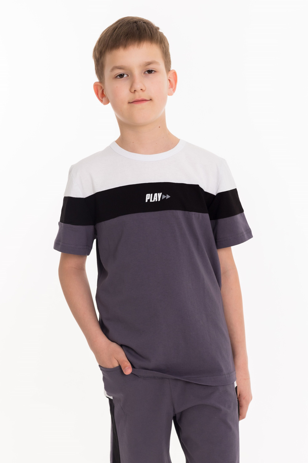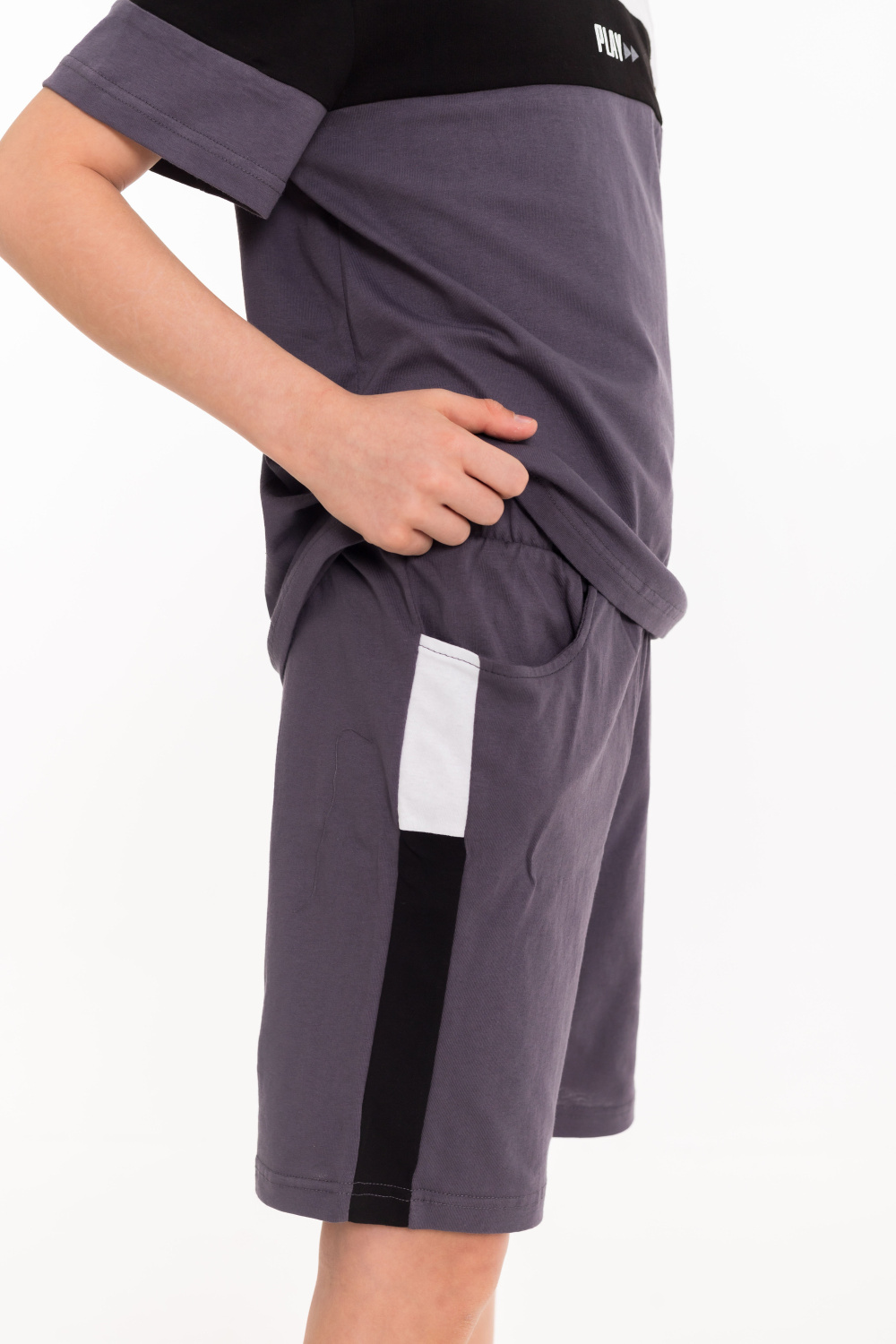 Костюм для мальчика выполнен из кулирки, состоит из футболки и шорт. Футболка с круглым вырезом горловины и принтом спереди. Шорты с поясом на резинке.