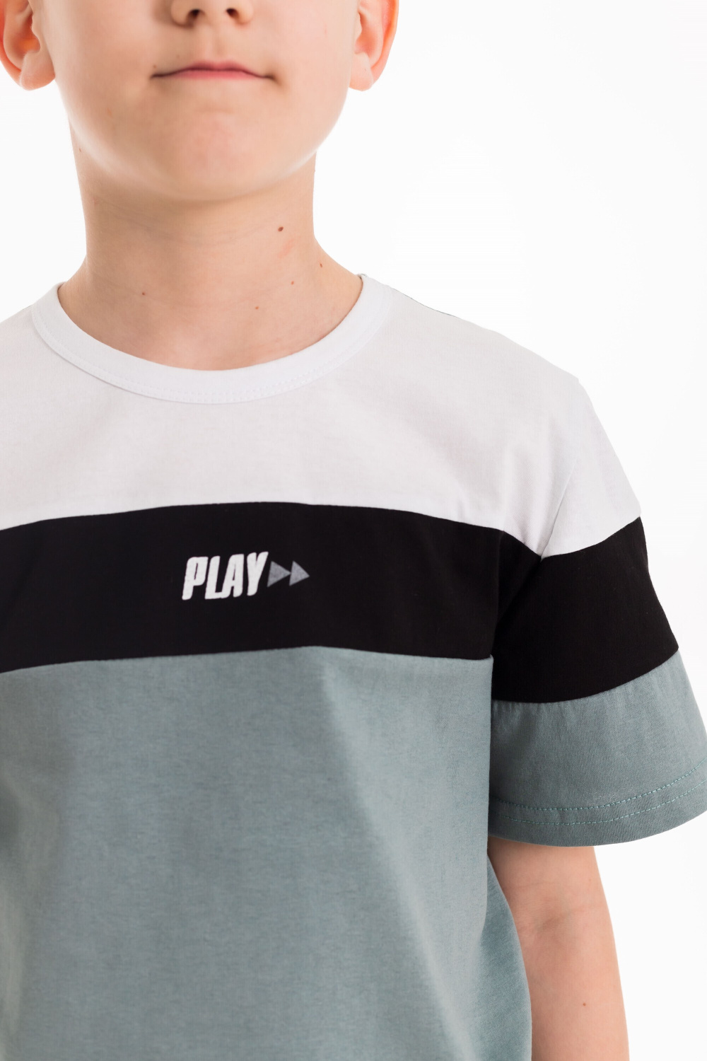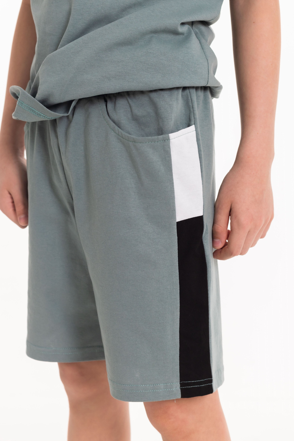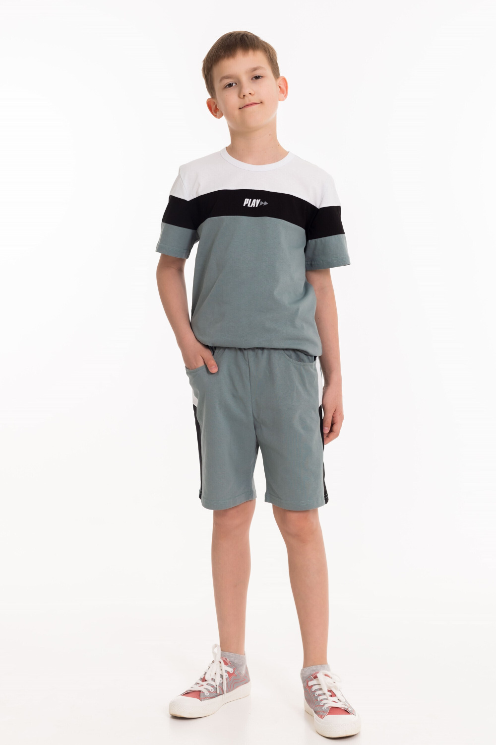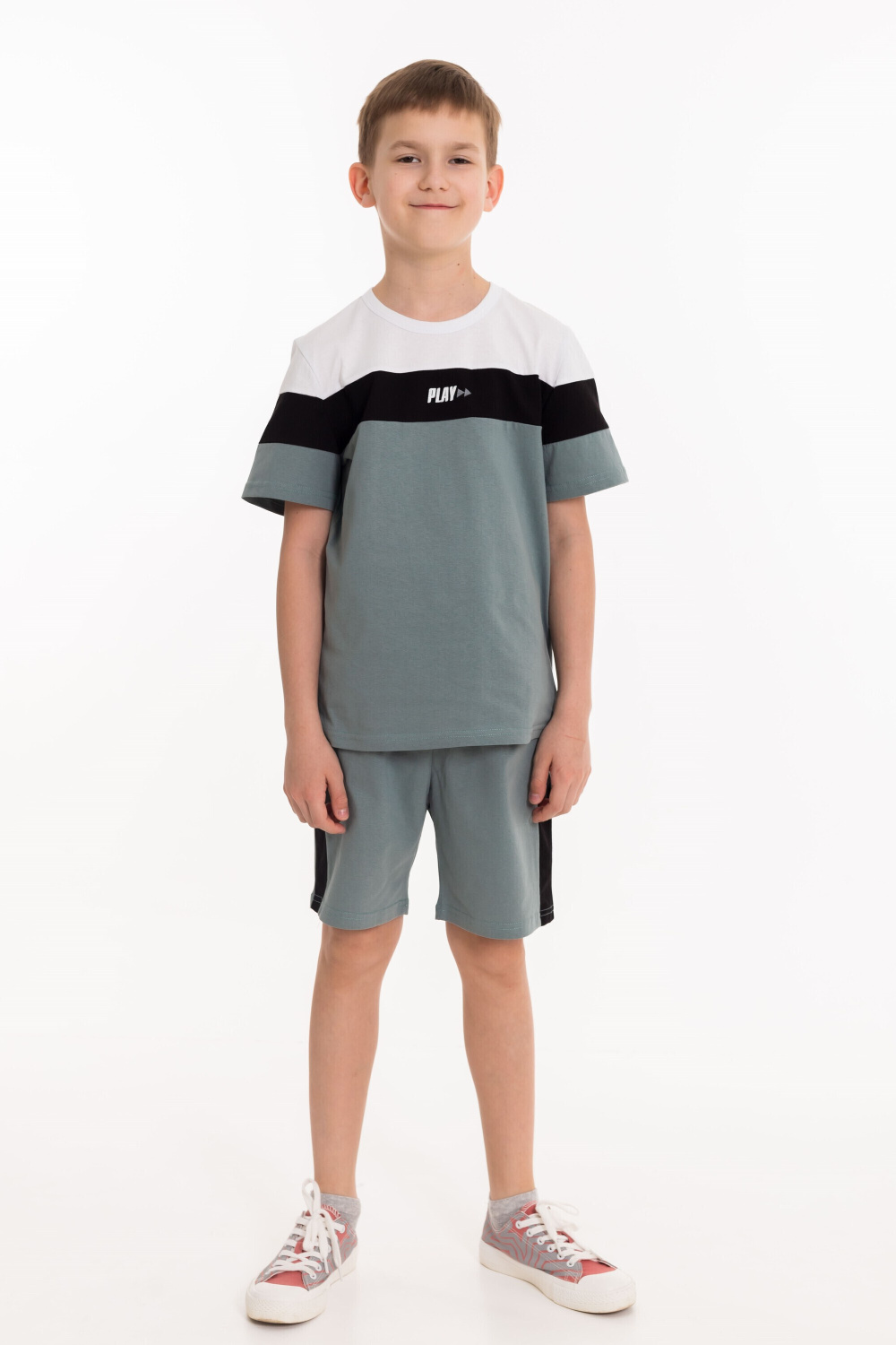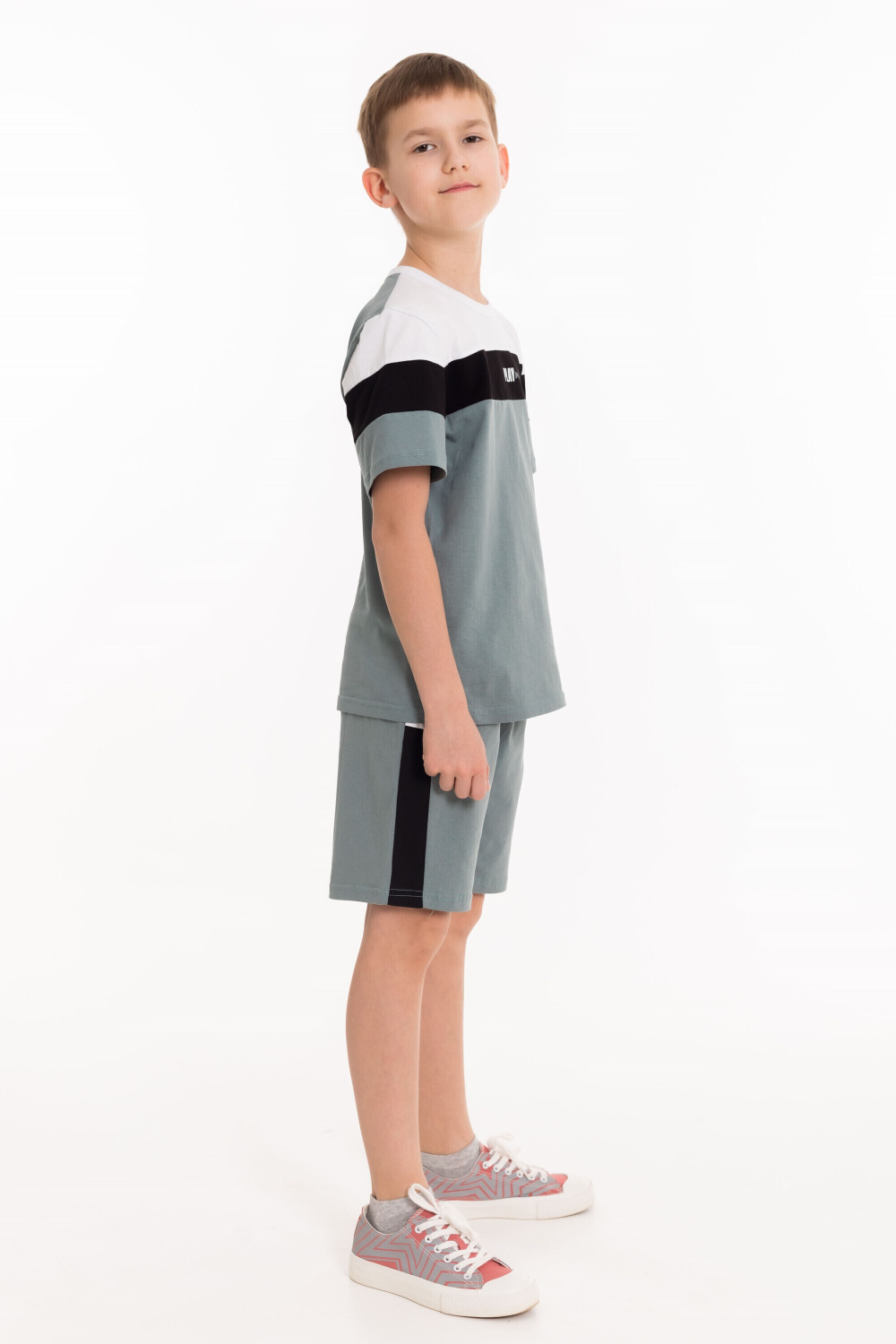 Костюм для мальчика выполнен из кулирки, состоит из футболки и шорт. Футболка с круглым вырезом горловины и принтом спереди. Шорты с поясом на резинке.