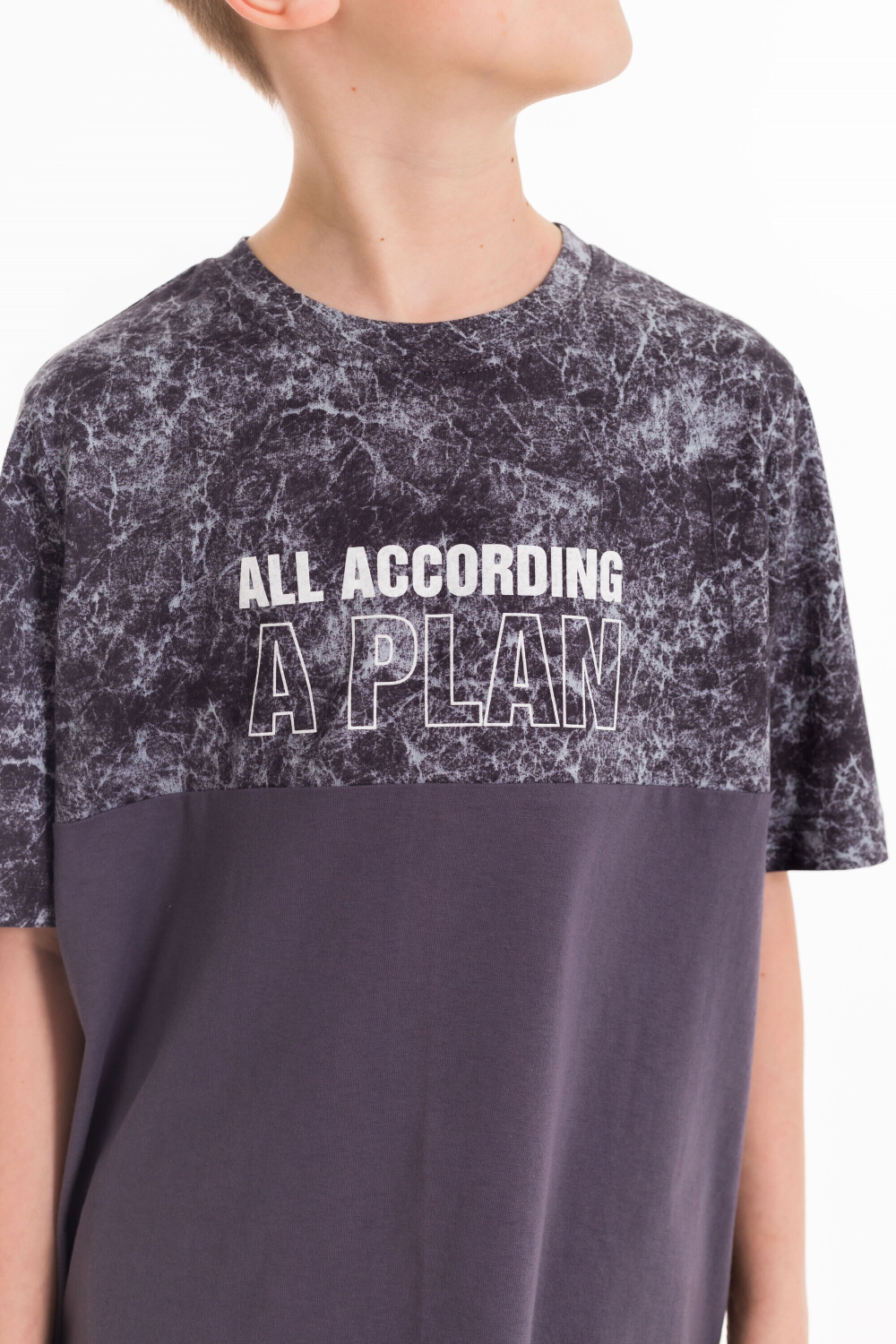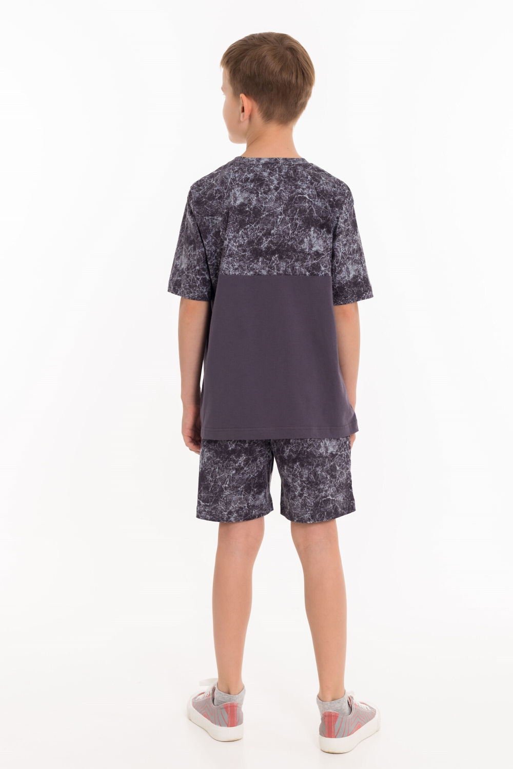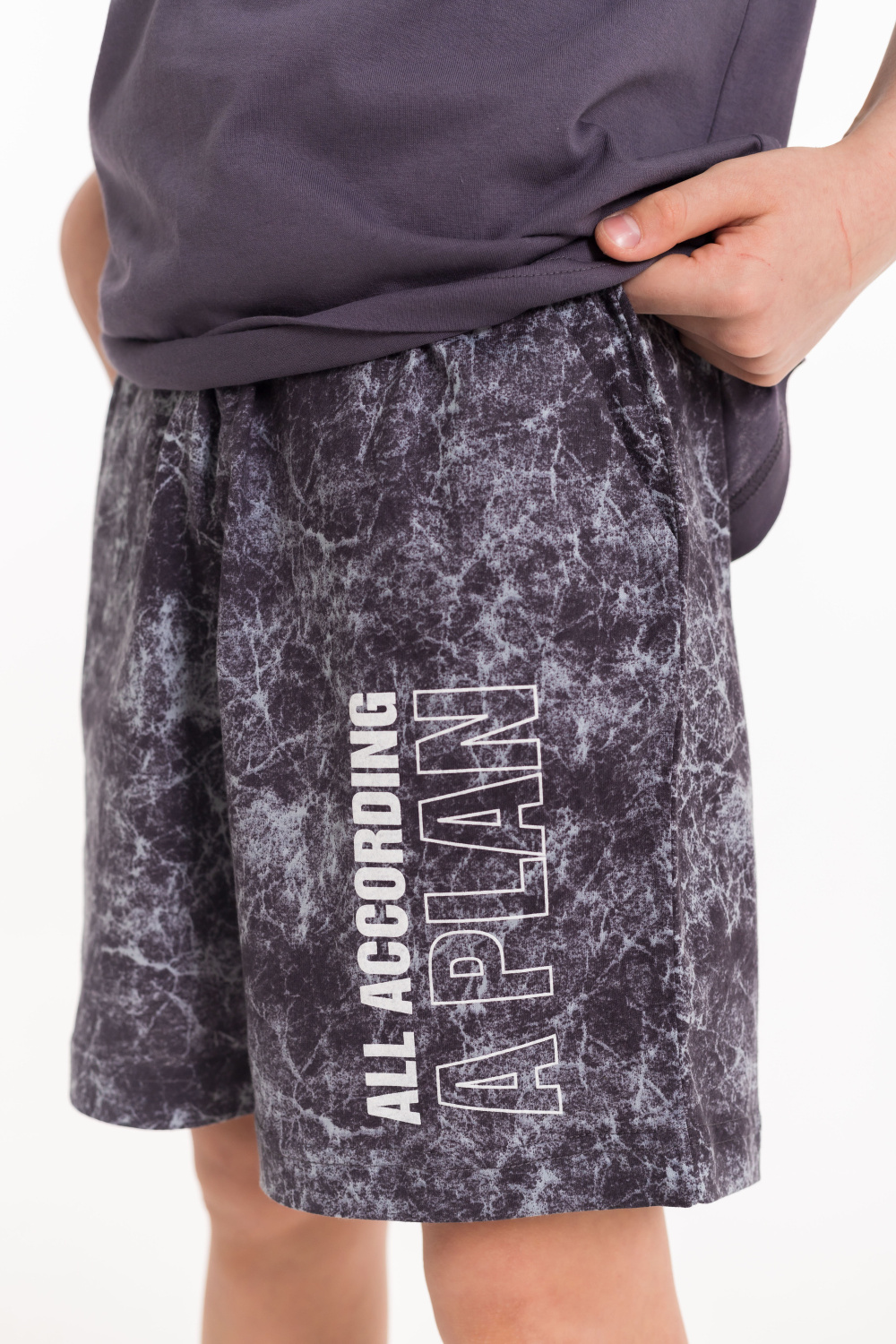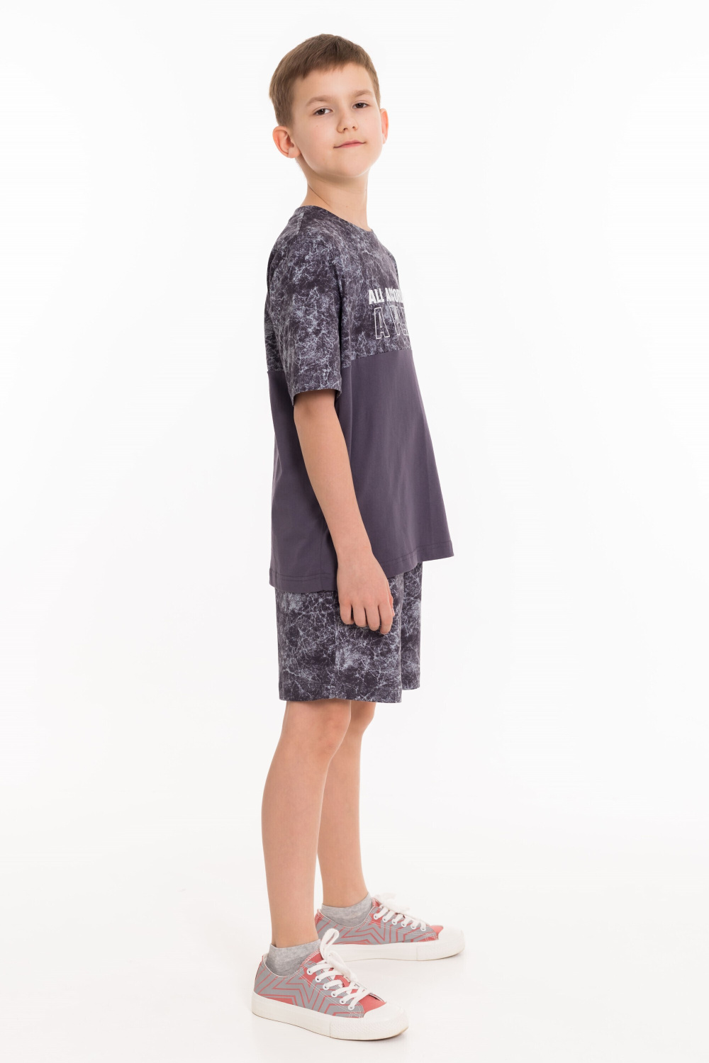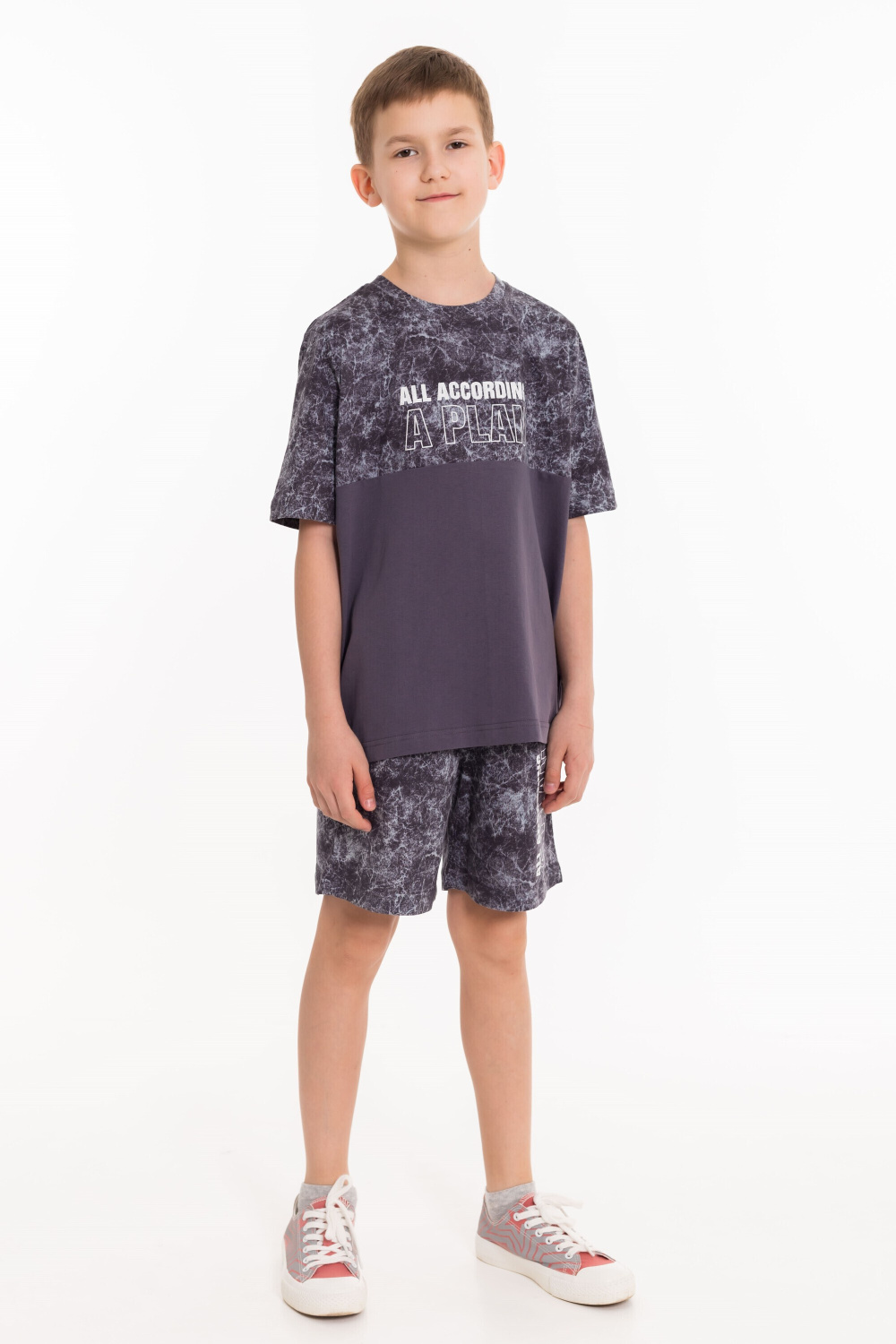 Костюм для мальчиков выполнен из кулирки, 100% хлопок. Футболка с круглым вырезом горловины, оформленным планкой, рукав втачной. Спереди нанесён принт. Шорты с боковыми карманами и поясом на резинке.