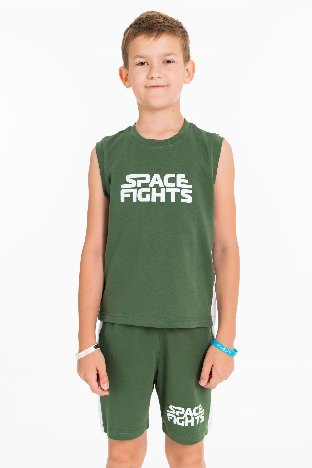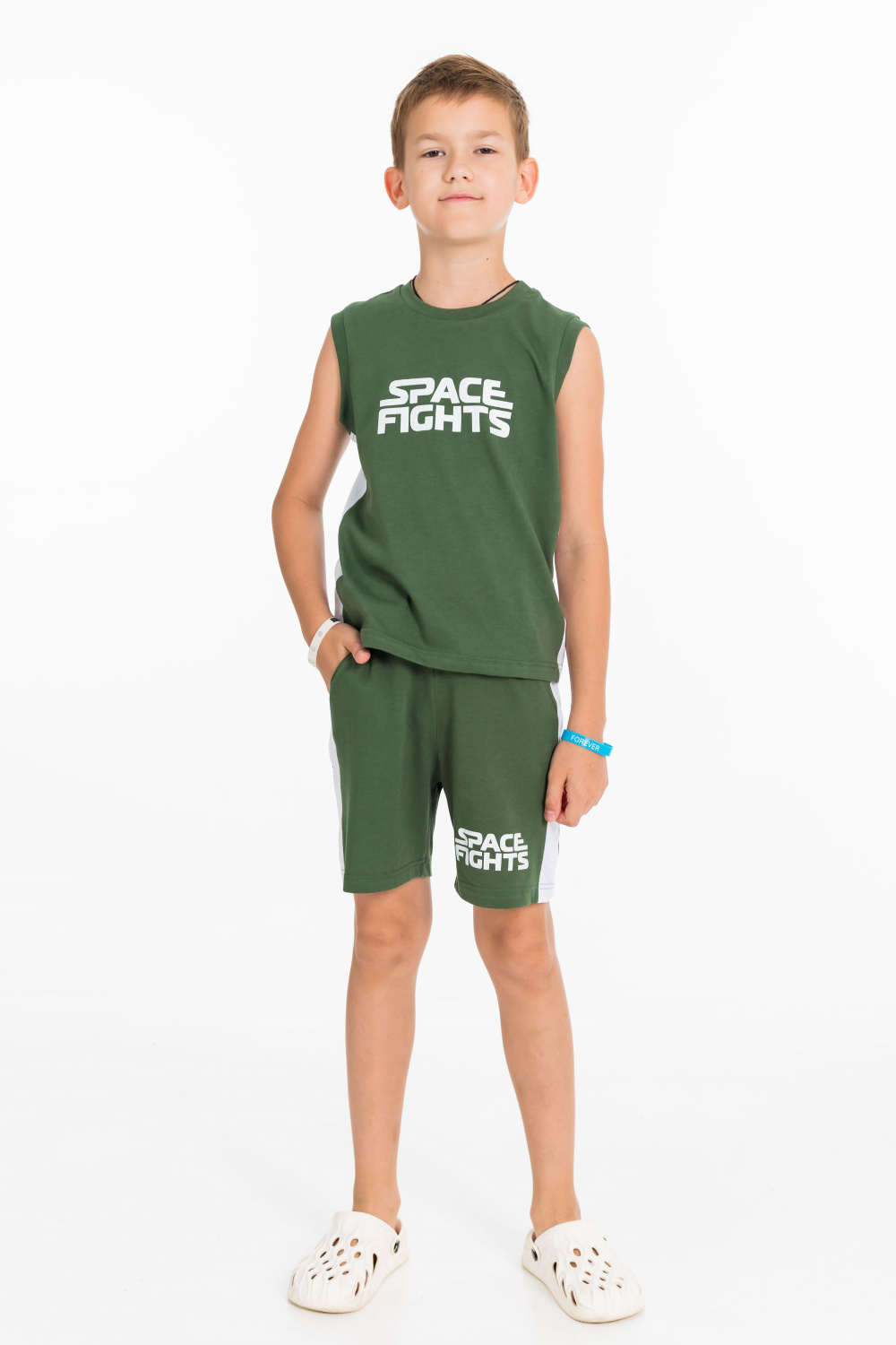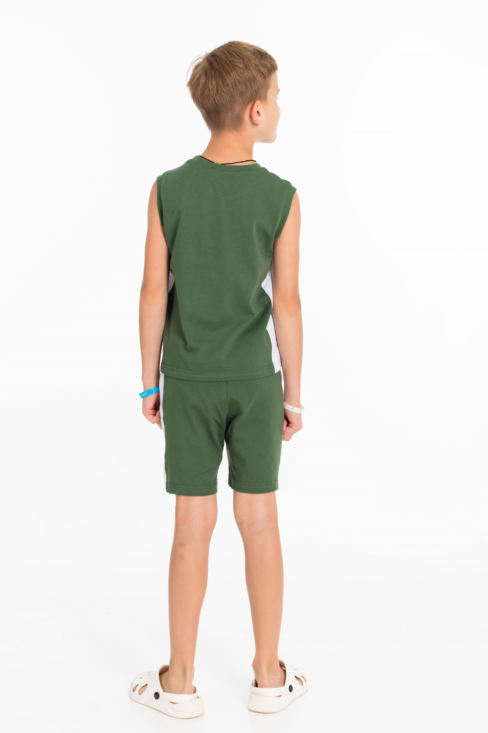 Костюм для мальчика состоит из шорт и майки. Проймы и горловина майки обработаны широкой бейкой. Шорты с поясом на резинке и карманами по бокам. На шортах и майке нанесены принты.