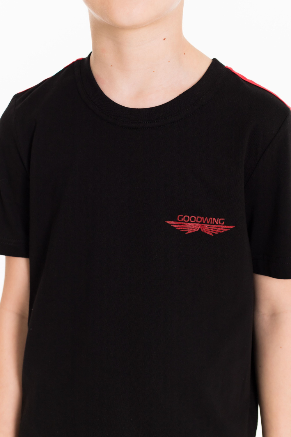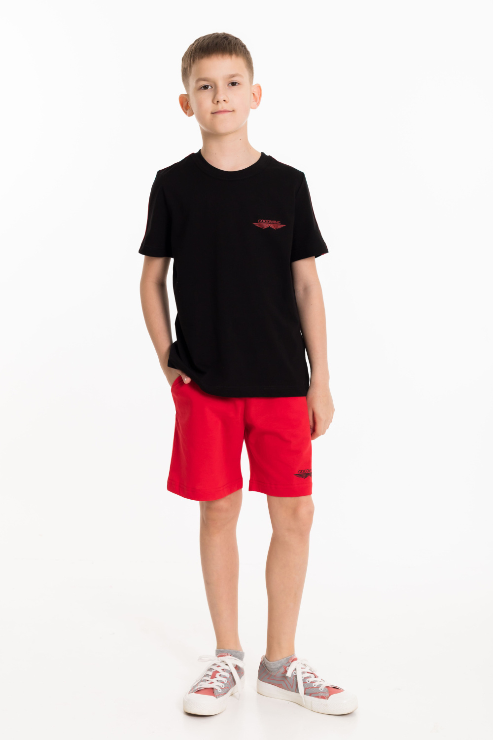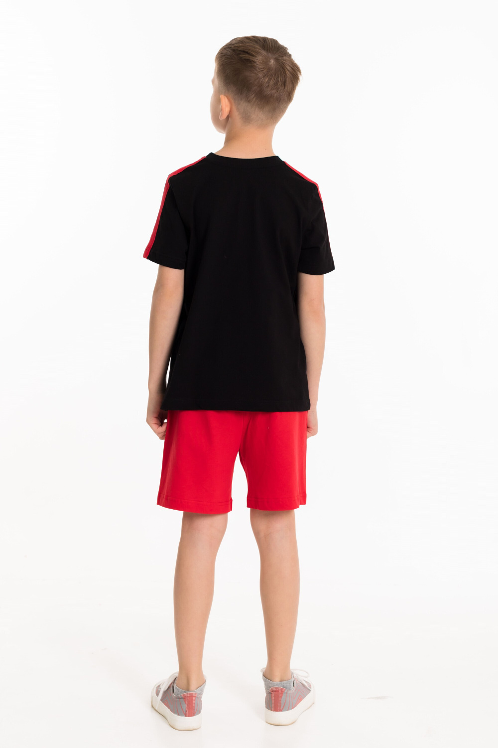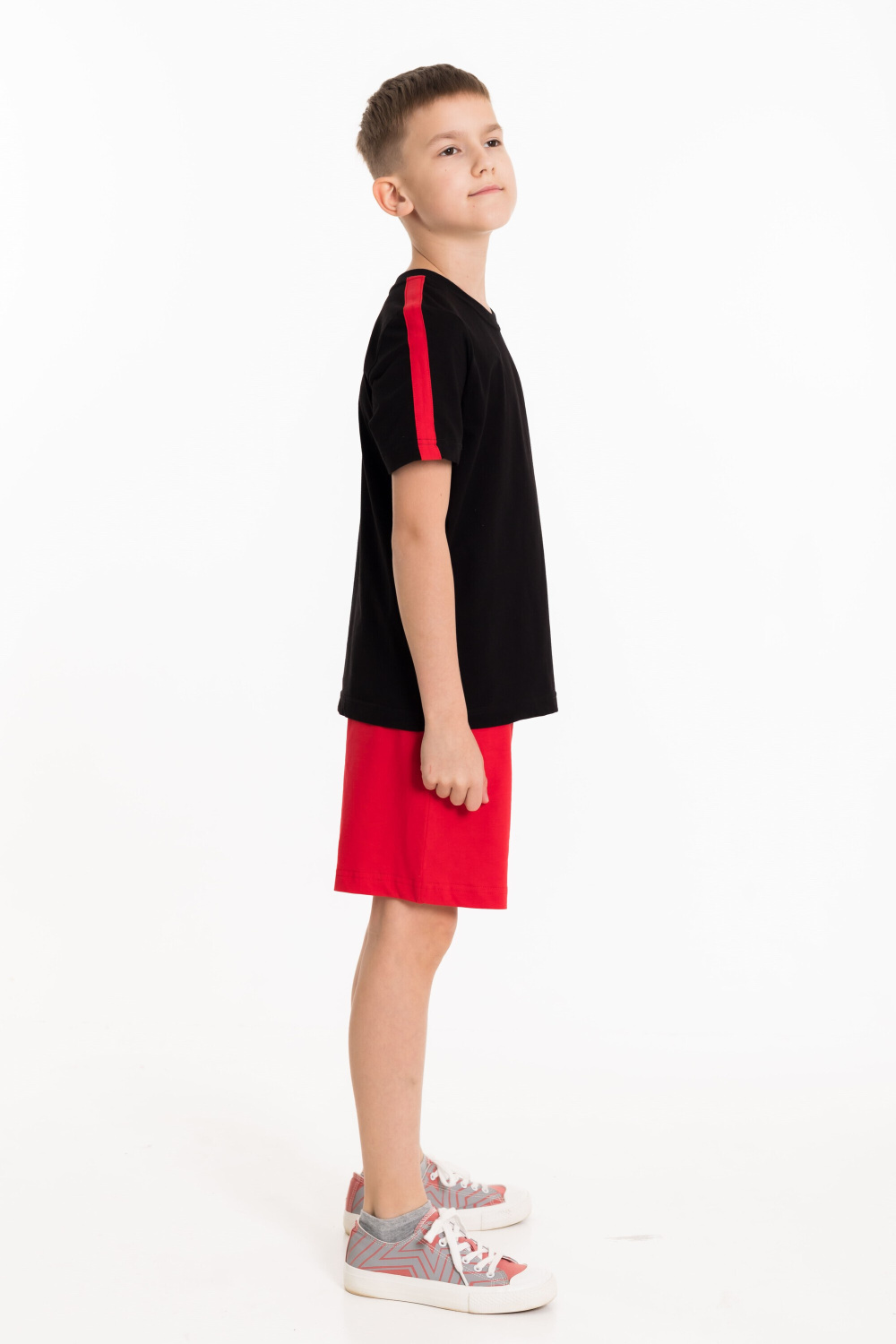 Костюм выполнен из однотонной кулирки двух цветов. Футболка с коротким втачным рукавом и круглым вырезом горловины. По плечевым участкам футболки широкие лампасы в цвет шорт. На футболке и шортах нанесён принт. Шорты свободные с боковыми карманами и притачным поясом на резинке.