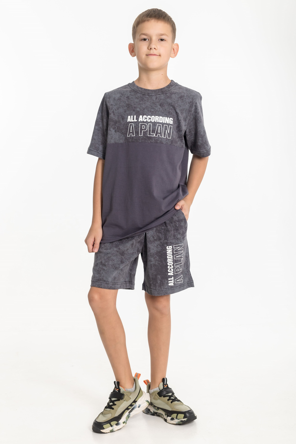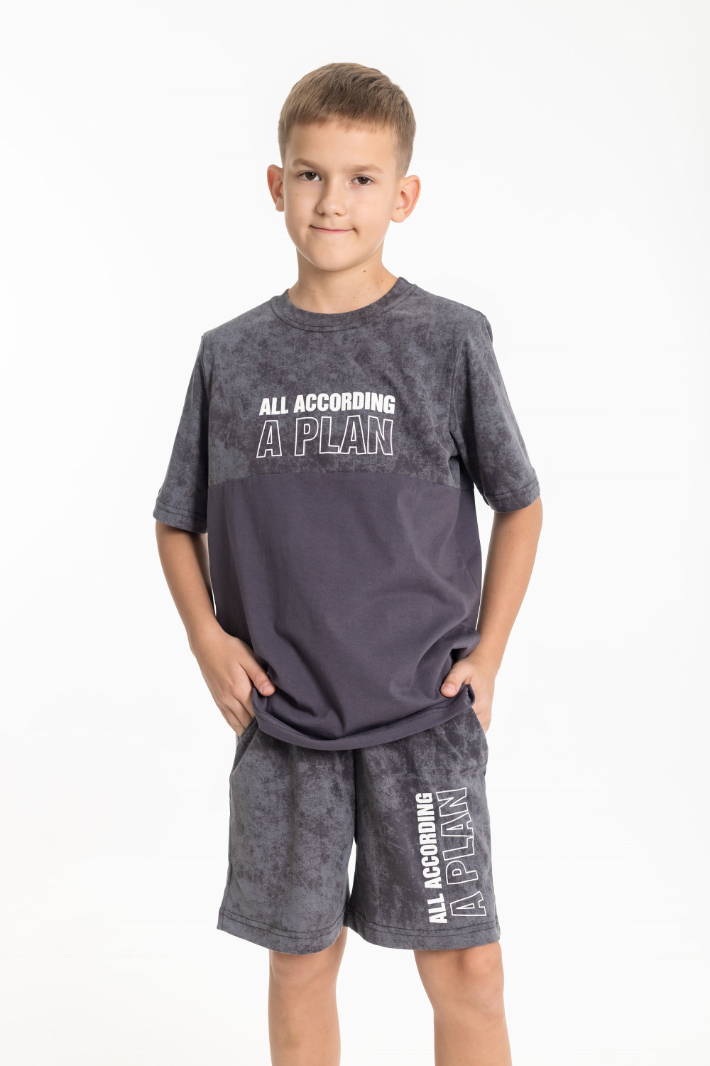 Костюм для мальчиков выполнен из кулирки, 100% хлопок. Футболка с круглым вырезом горловины, оформленным планкой, рукав втачной. Спереди нанесён принт. Шорты с боковыми карманами и поясом на резинке.