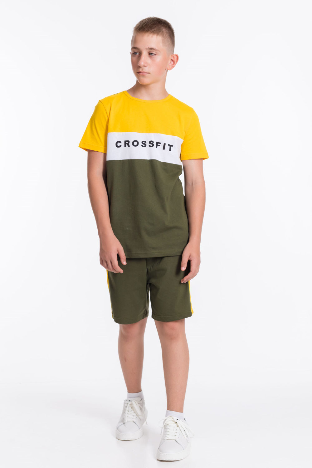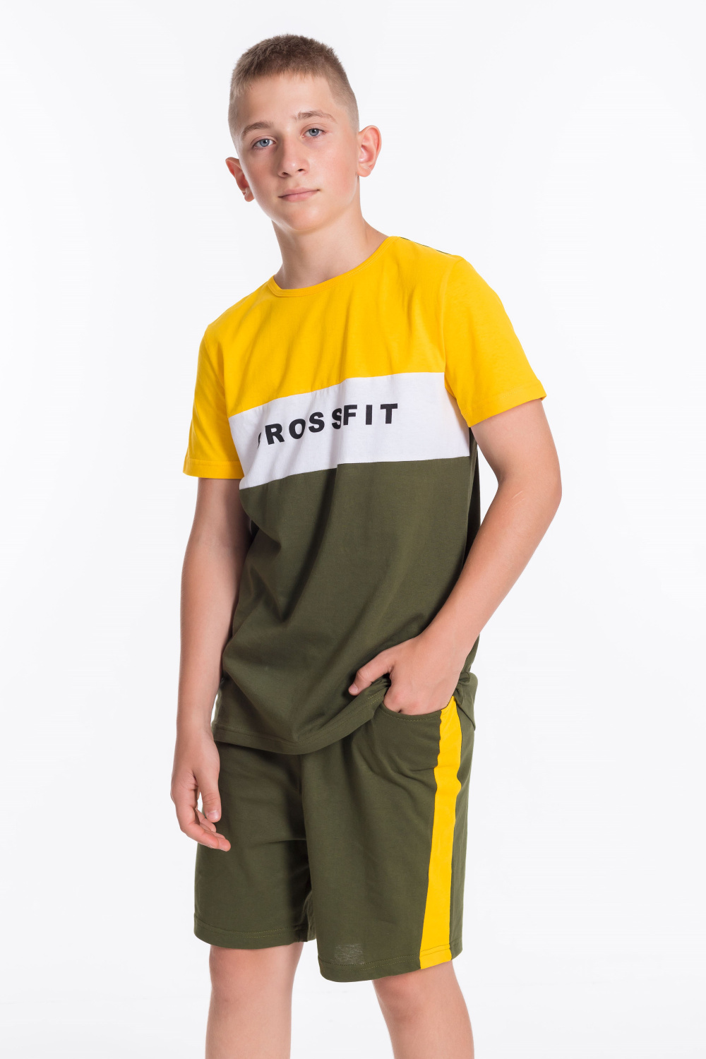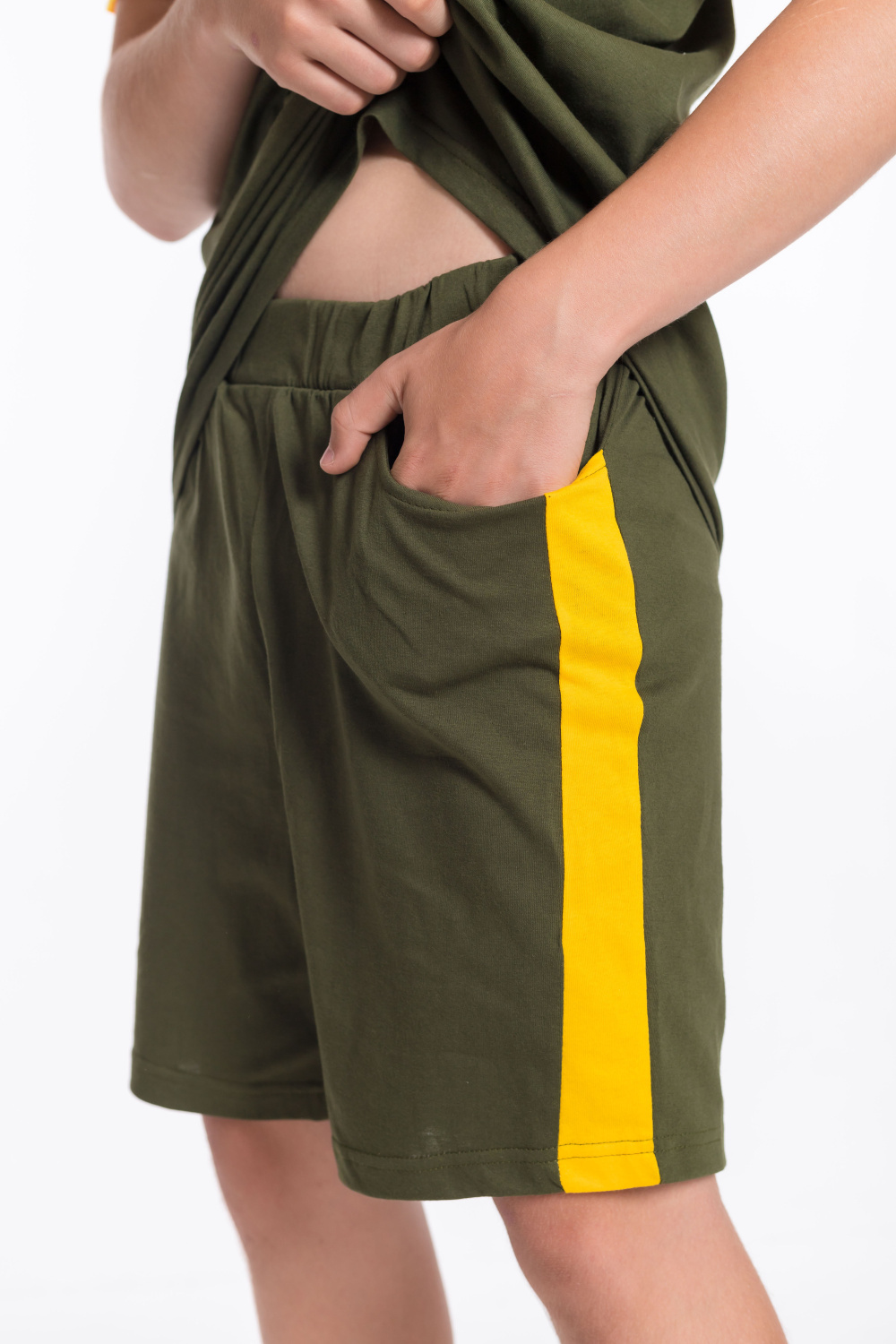 Костюм для мальчика выполнен из мягкой и приятной к телу ткани — кулирки (100% хлопок), комбинирован из трёх цветов. Он состоит из свободных шорт и футболки, что обеспечивает комфорт и свободу движений.