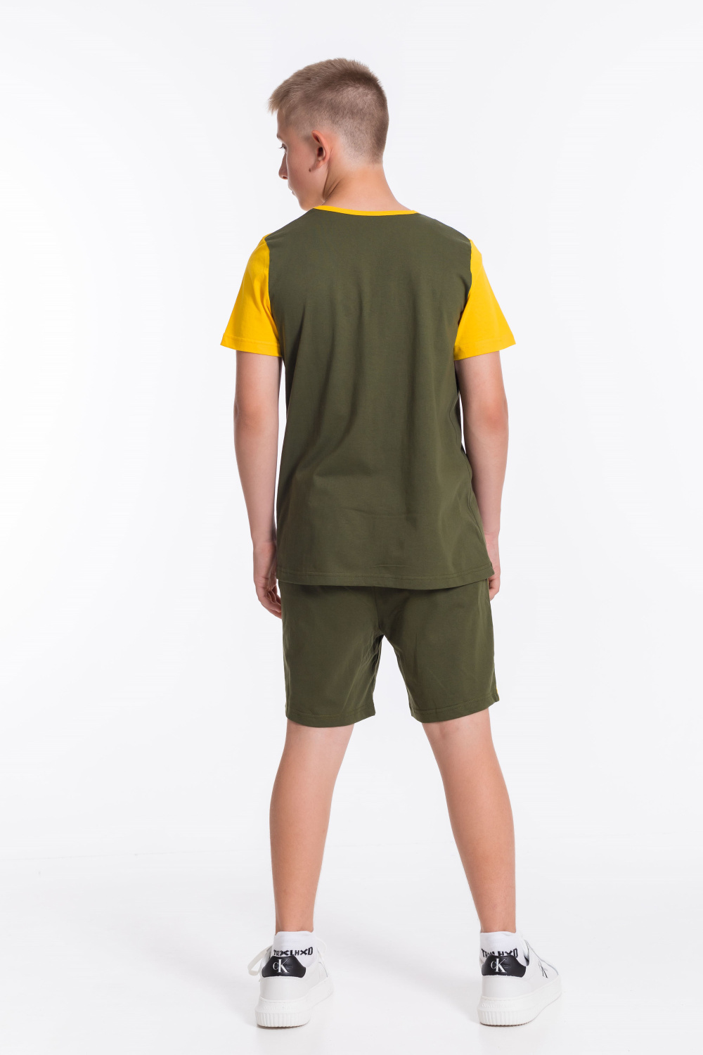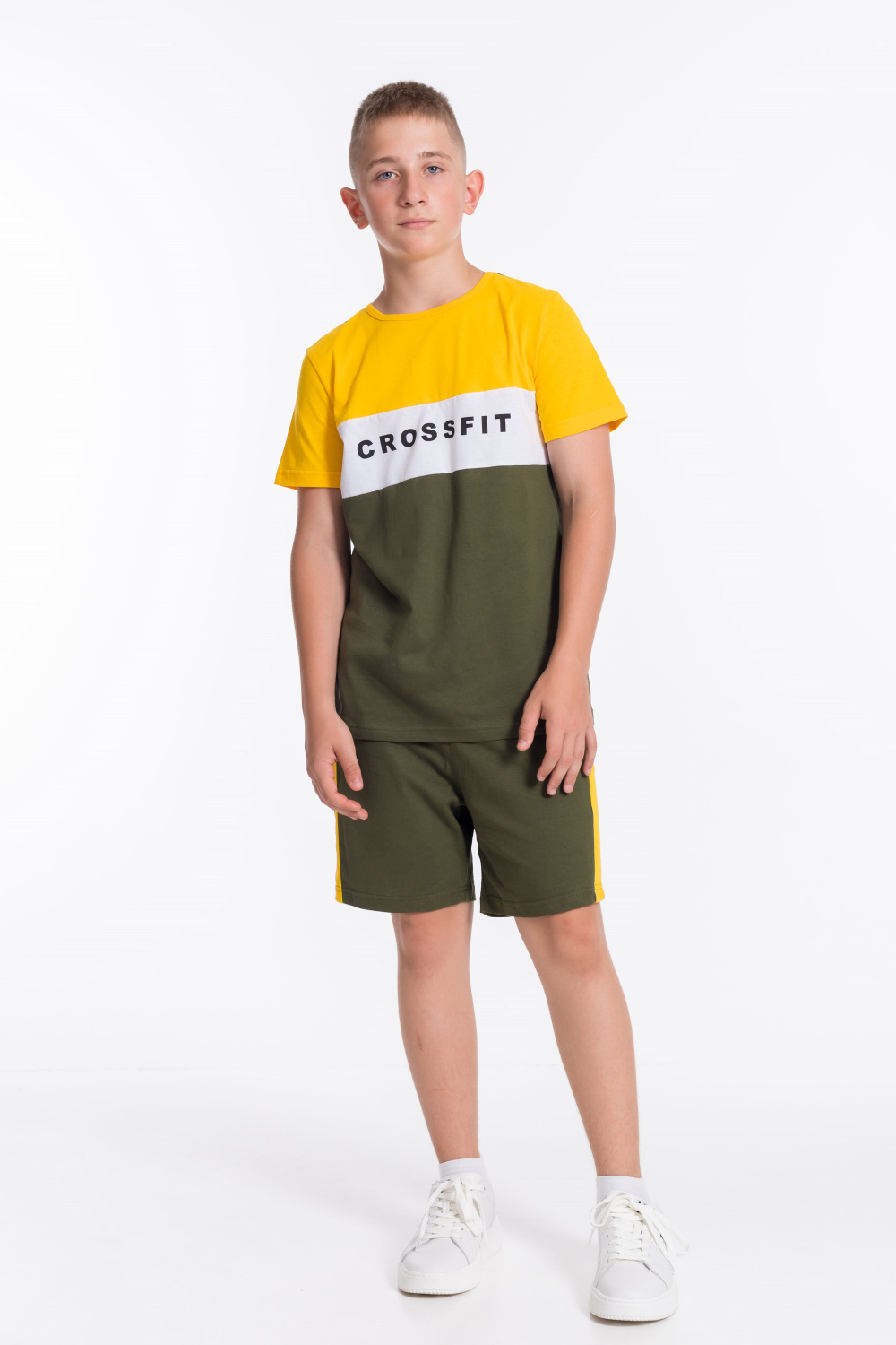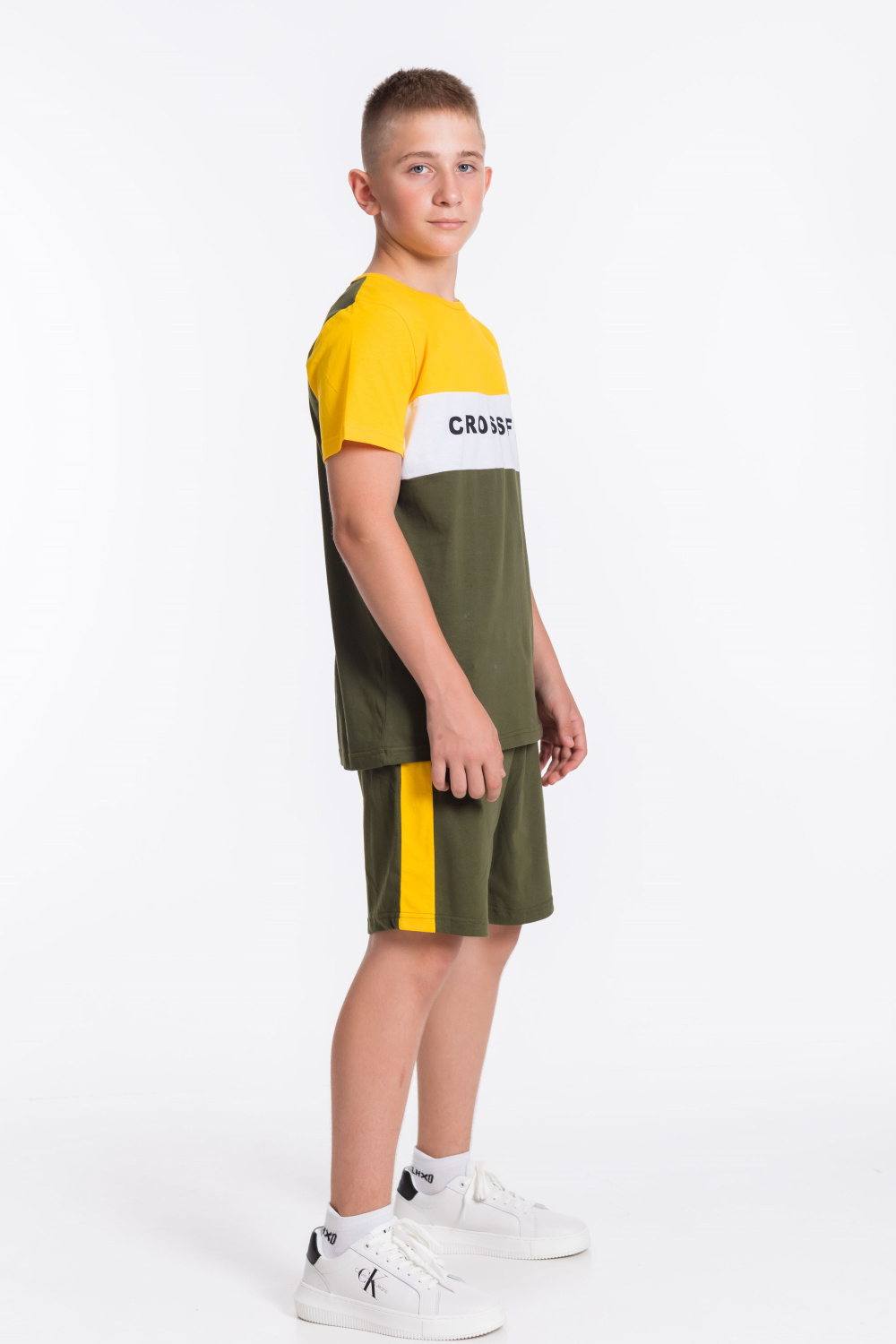 Костюм для мальчика выполнен из мягкой и приятной к телу ткани — кулирки (100% хлопок), комбинирован из трёх цветов. Он состоит из свободных шорт и футболки, что обеспечивает комфорт и свободу движений.
