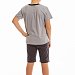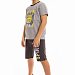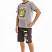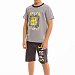 Костюм для мальчика выполнен из хлопкового полотна, состоит из футболки и шорт. Футболка с коротким рукавом и круглым вырезом горловины. Шорты средней длины, свободного покроя с поясом на резинке. На футболке и шортах спереди нанесён принт.
