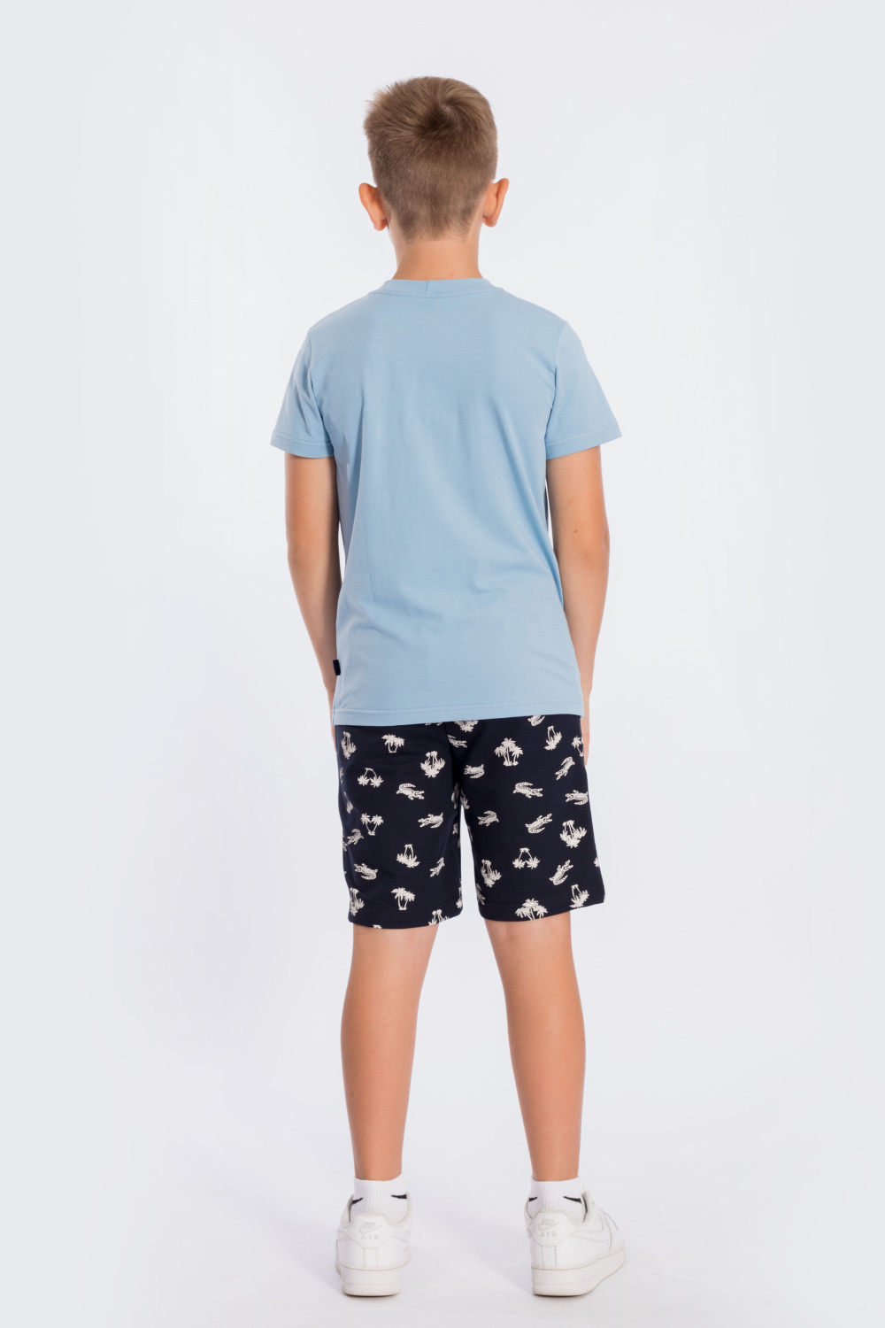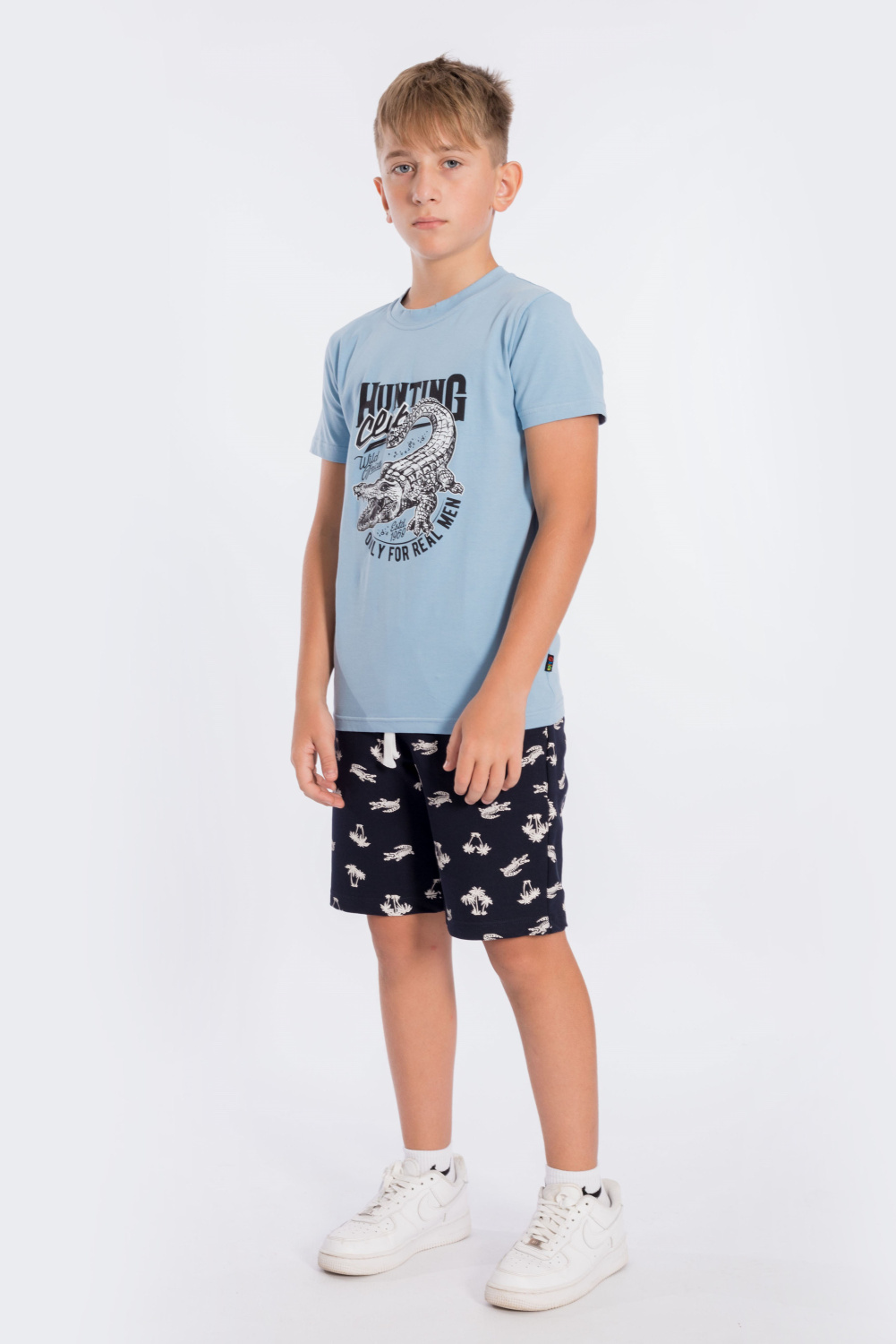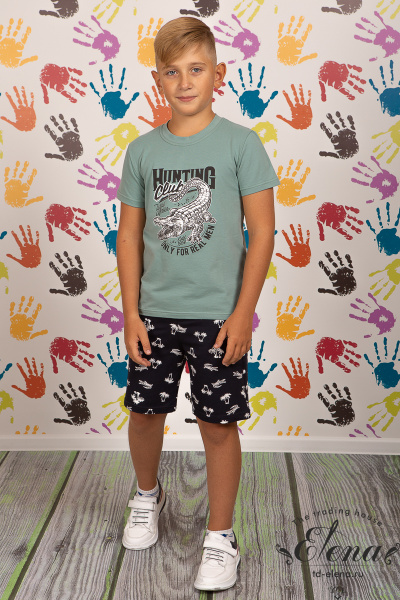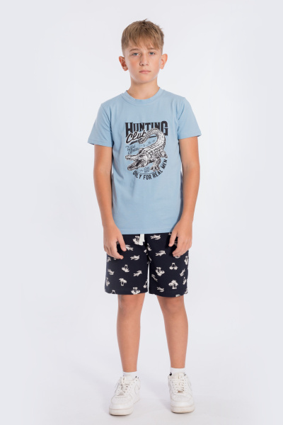 Костюм для мальчика состоит из шорт и футболки. Шорты из футер петли с лайкрой. Пояс притачной, с резиной внутри. Есть два кармана по бокам. Футболка из кулирки с лайкрой. С коротким рукавом и красивым принтом спереди.