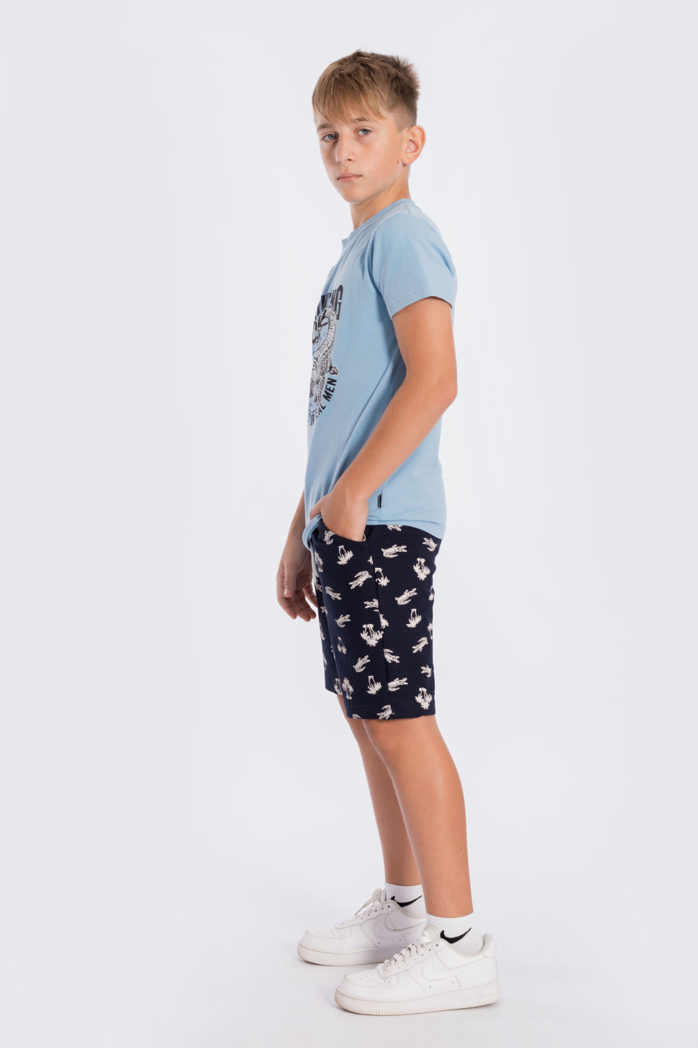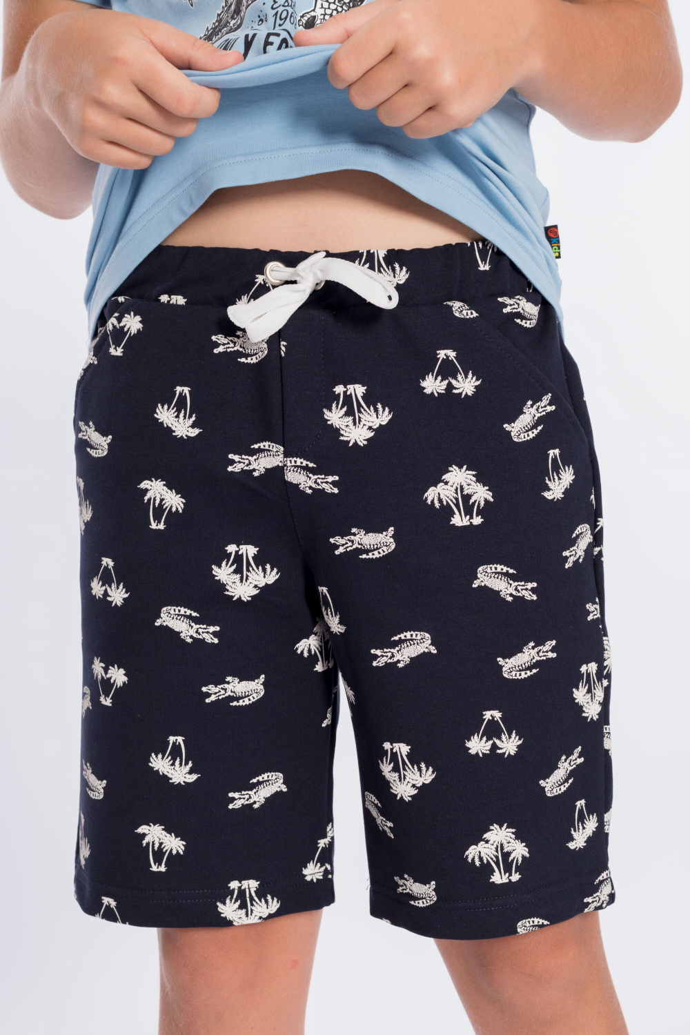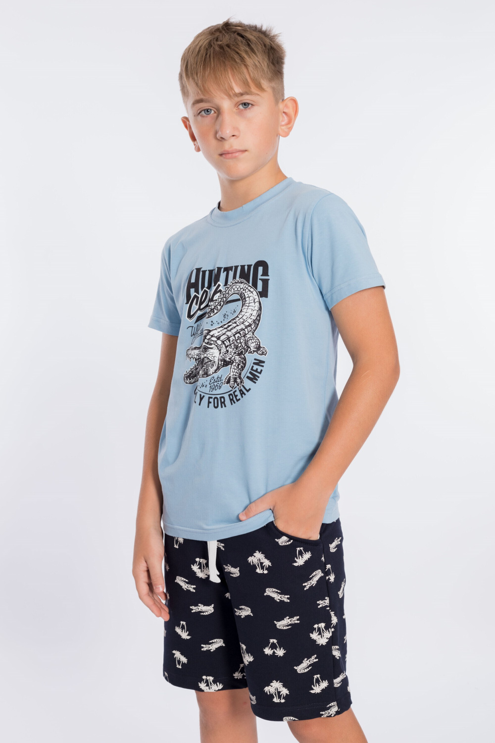 Костюм для мальчика состоит из шорт и футболки. Шорты из футер петли с лайкрой. Пояс притачной, с резиной внутри. Есть два кармана по бокам. Футболка из кулирки с лайкрой. С коротким рукавом и красивым принтом спереди.