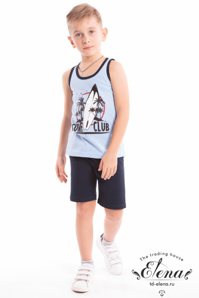 Летний костюм на мальчика (майка+шорты) выполнен из лёгкой хлопковой ткани двух контрастных расцветок. Майка на тонких лямках, круглый вырез горловины и проймы отделаны бейкой. Спереди нанесён принт. Шорты свободного кроя, однотонные, средней длины, пояс под резинку.