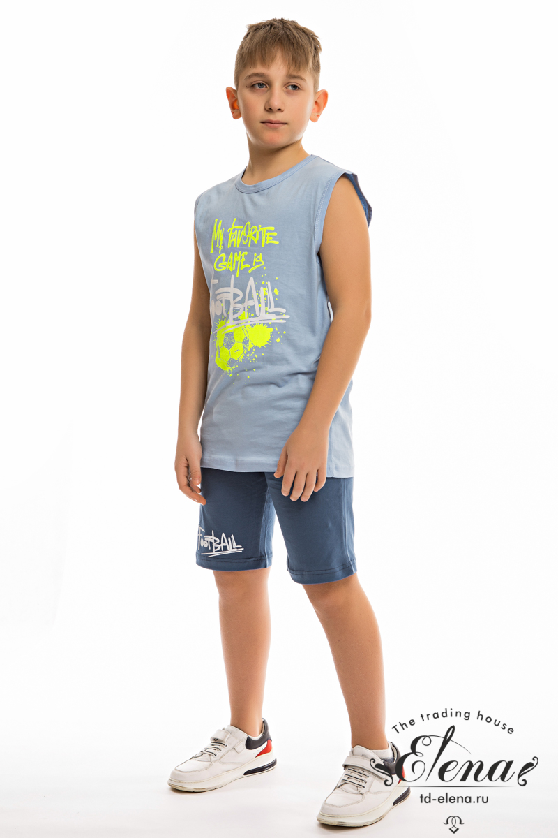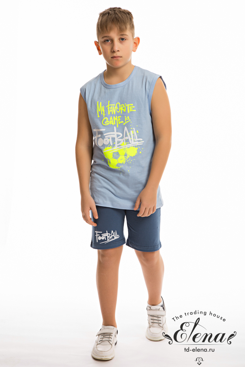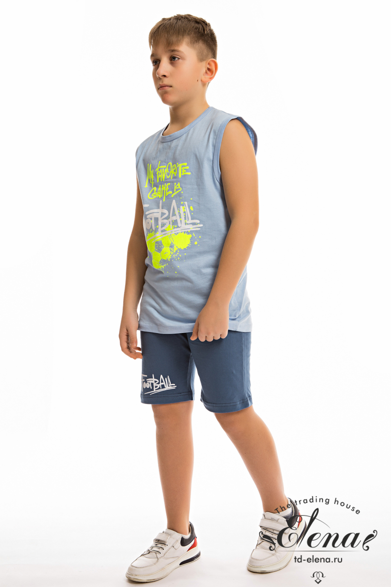 Костюм для мальчика выполнен из кулирки, состоит из шорт и майки. Майка однотонная, с принтом спереди, проймы и горловина обработаны бейкой. Шорты с поясом на резинке и принтом.