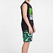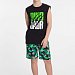 Костюм для мальчика состоит из шорт и майки. Майка из однотонной кулирки, проймы и горловина обработаны широкой бейкой. На майке нанесён принт. Шорты выполнены из кулирки с набивным рисунком. Пояс на резинке.