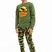 Костюм для мальчика пошит из хлопка комбинированных расцветок, состоит из футболки и брюк, футболка с длинным рукавом и принтом спереди, низ рукавов и горловина обработаны бейкой, брюки без боковых швов на резине по поясу.