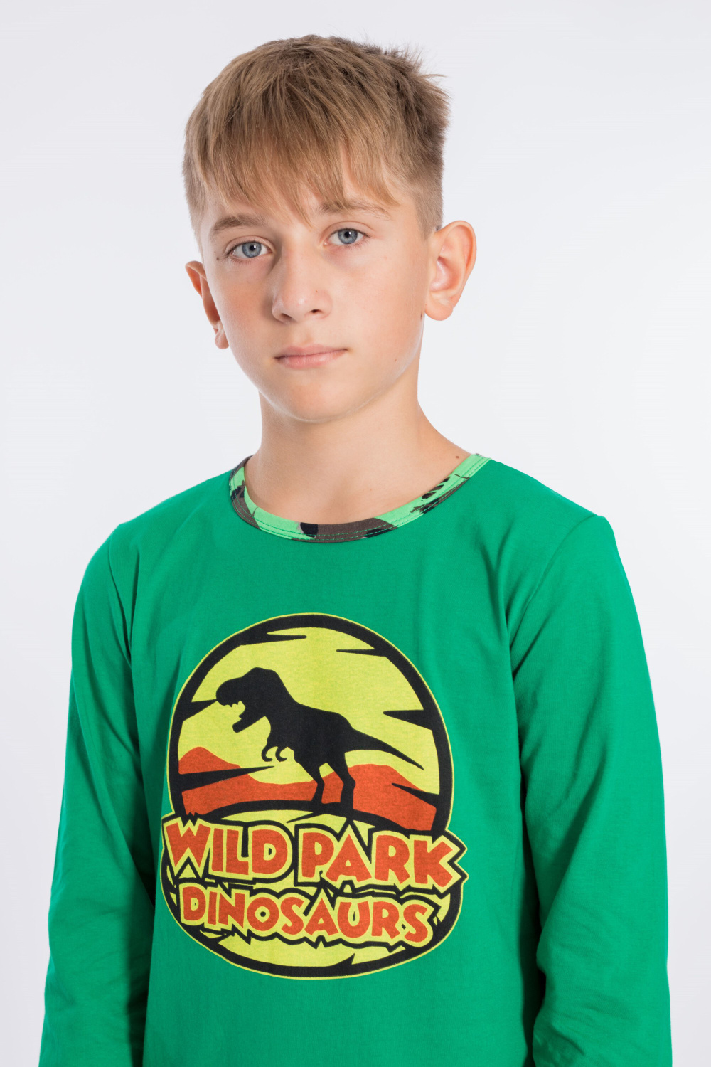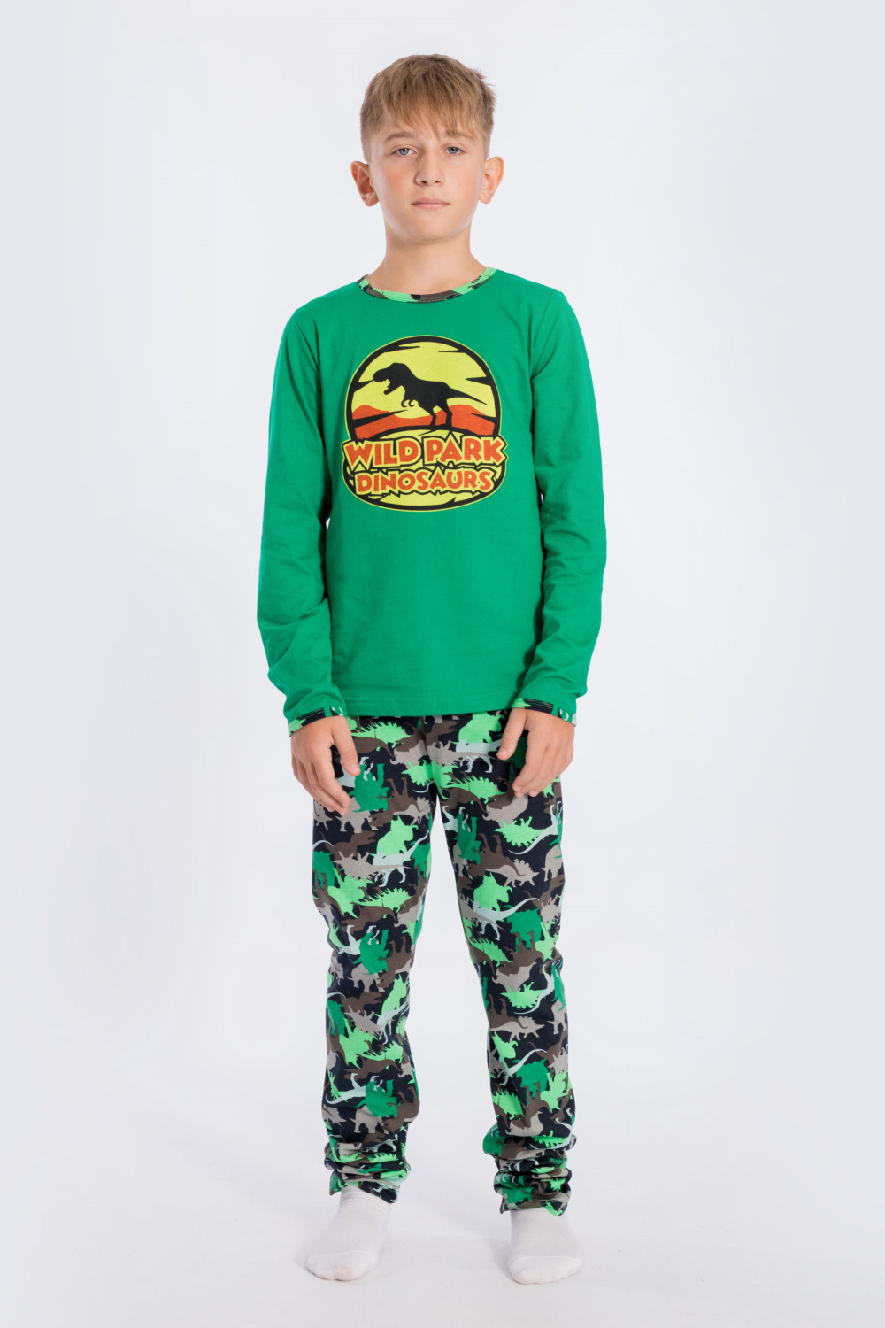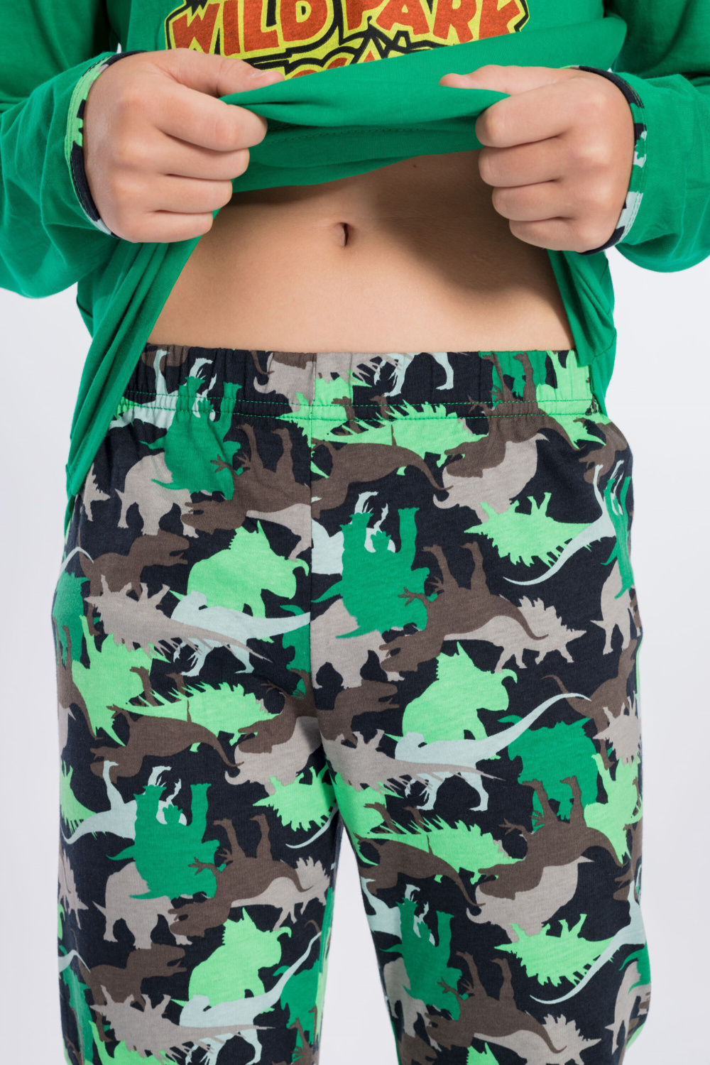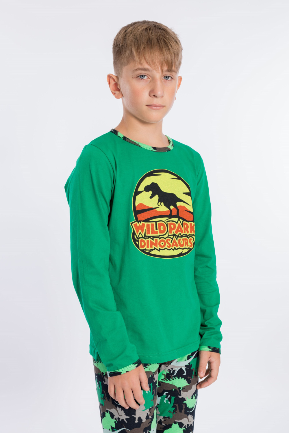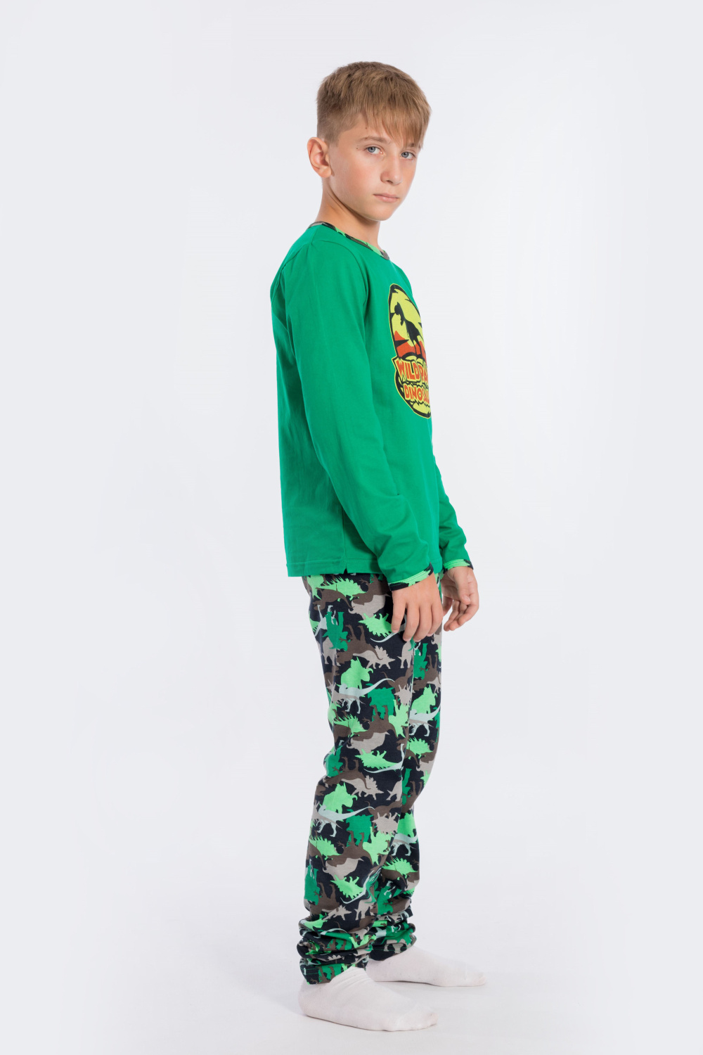 Костюм для мальчика пошит из хлопка комбинированных расцветок, состоит из футболки и брюк, футболка с длинным рукавом и принтом спереди, низ рукавов и горловина обработаны бейкой, брюки без боковых швов на резине по поясу.