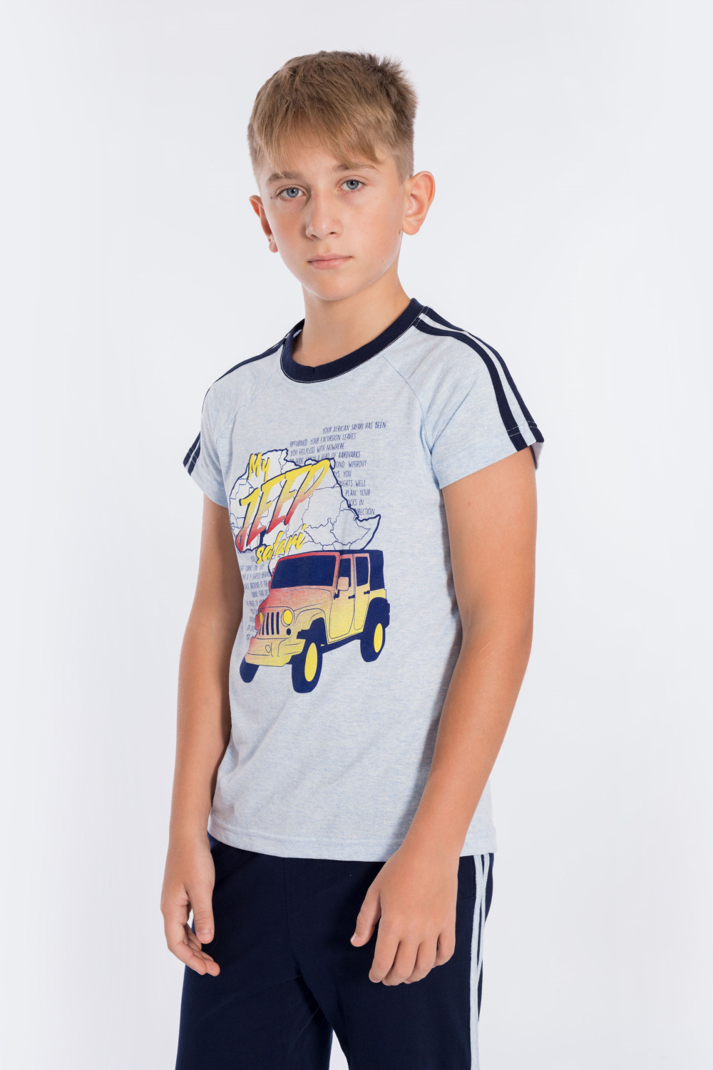 Костюм для мальчика выполнен из кулирки, 100% хлопок. Футболка с принтом спереди. Вырез горловины круглый, рукава покроя реглан с лампасами. Капри с карманами по бокам и лампасами, пояс на резинке.