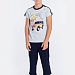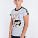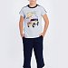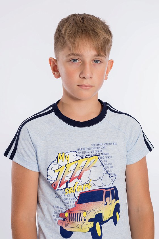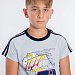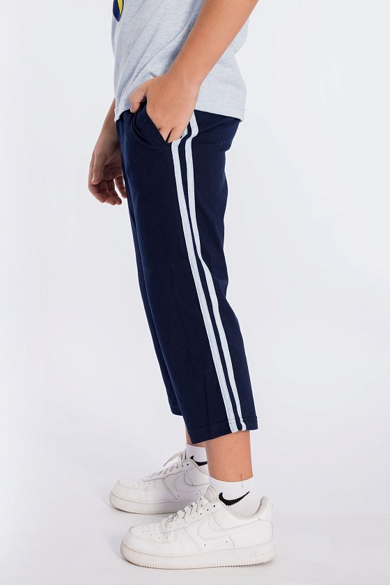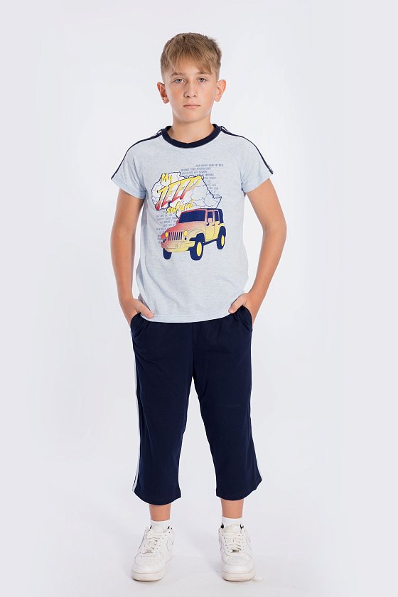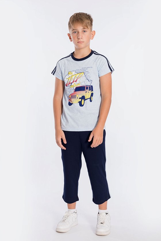Костюм для мальчика выполнен из кулирки, 100% хлопок. Футболка с принтом спереди. Вырез горловины круглый, рукава покроя реглан с лампасами. Капри с карманами по бокам и лампасами, пояс на резинке.