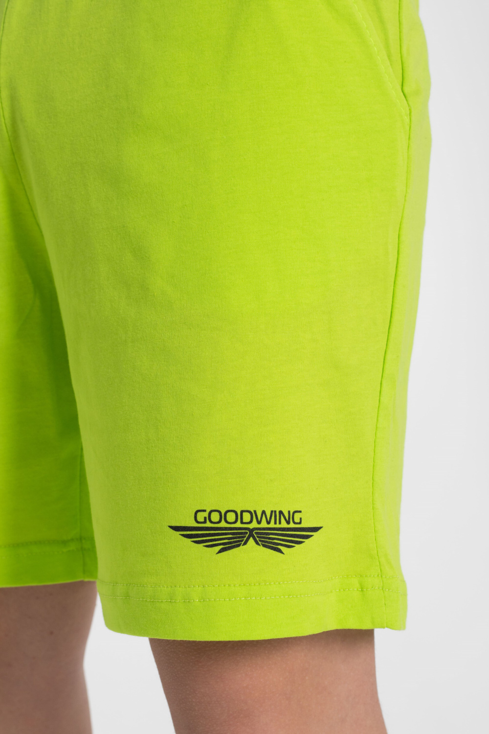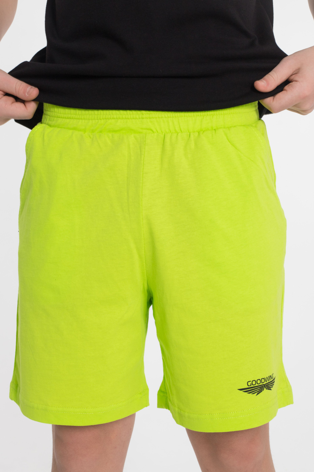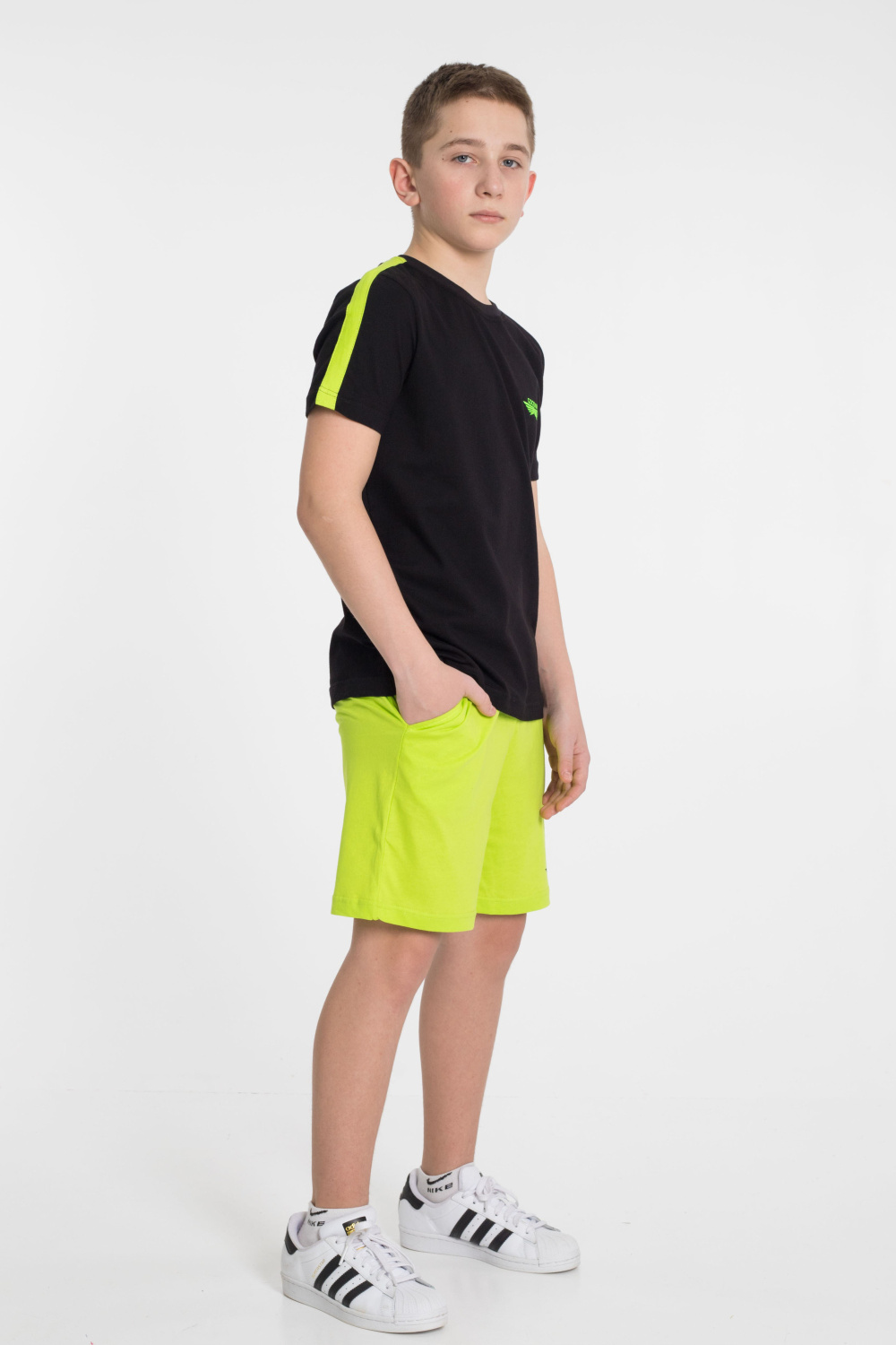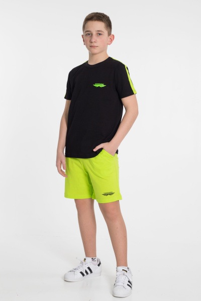 Шорты - свободные с боковыми карманами и притачным поясом. Футболка - короткий втачной рукав, круглый вырез горловины.