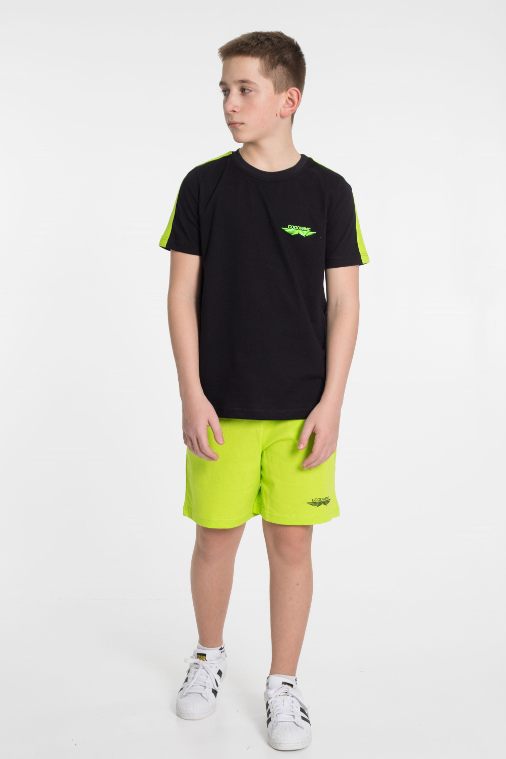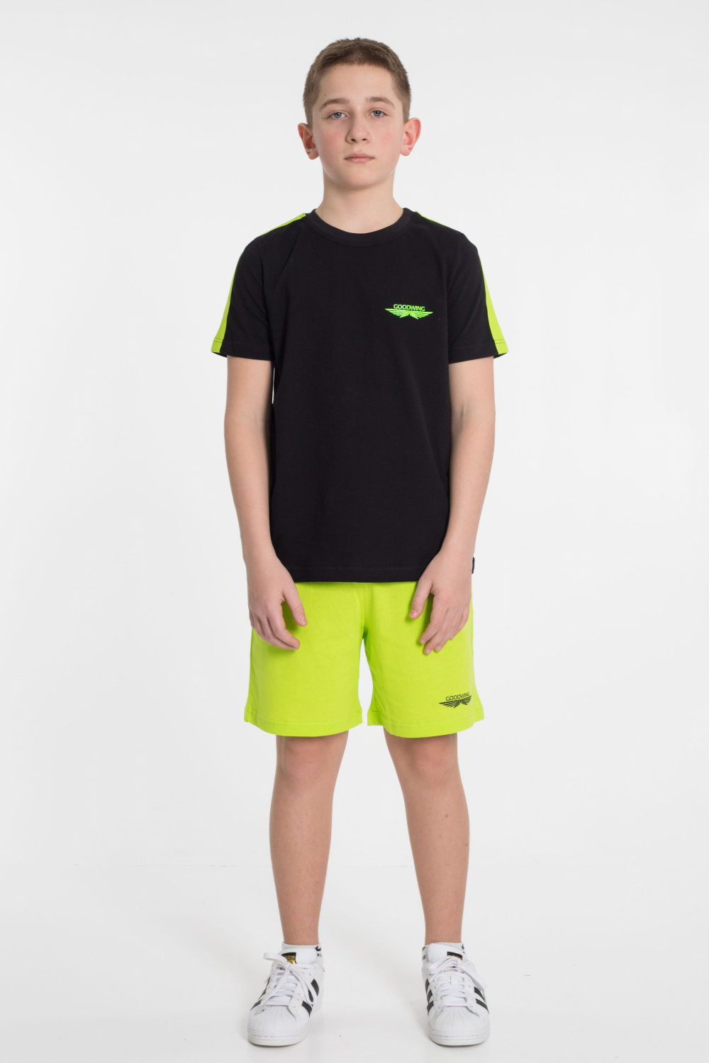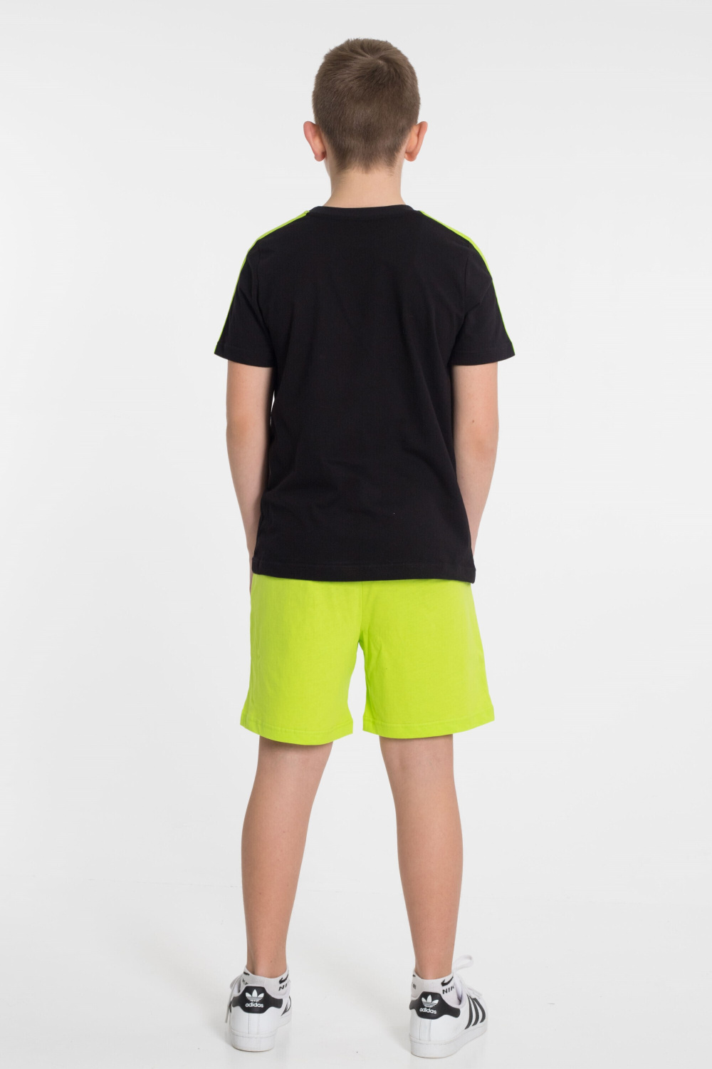 По плечевым участкам футболки широкие лампасы в цвет шорт.