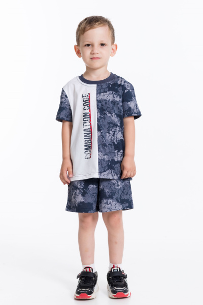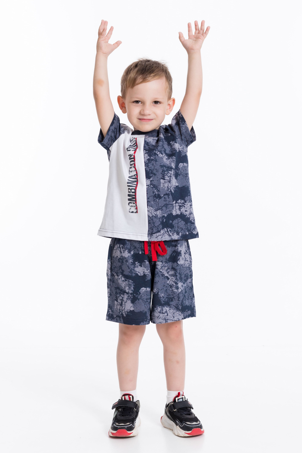 Костюм для мальчика выполнен из хлопкового полотна, состоит из футболки и шорт. Футболка с коротким рукавом и круглым вырезом горловины. Шорты средней длины, свободного кроя с поясом на резинке и шнуре. На правой полочке футболки принт.