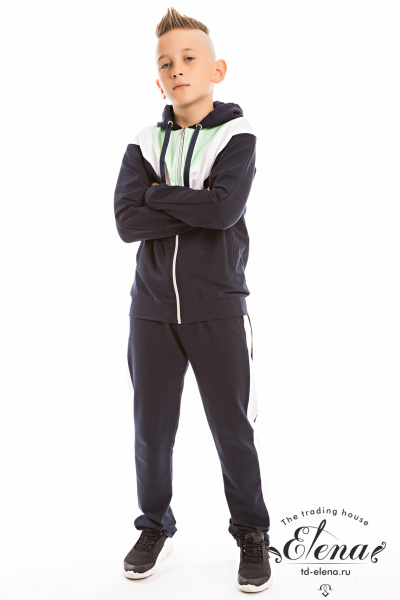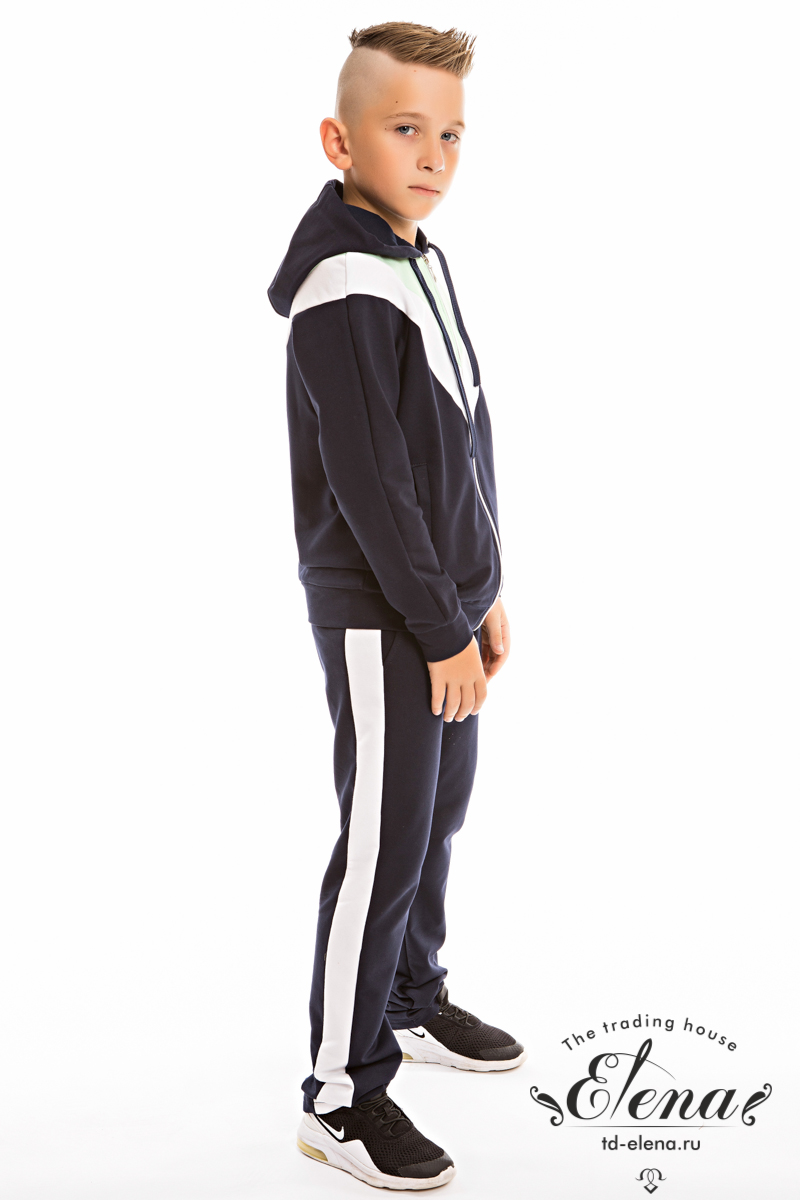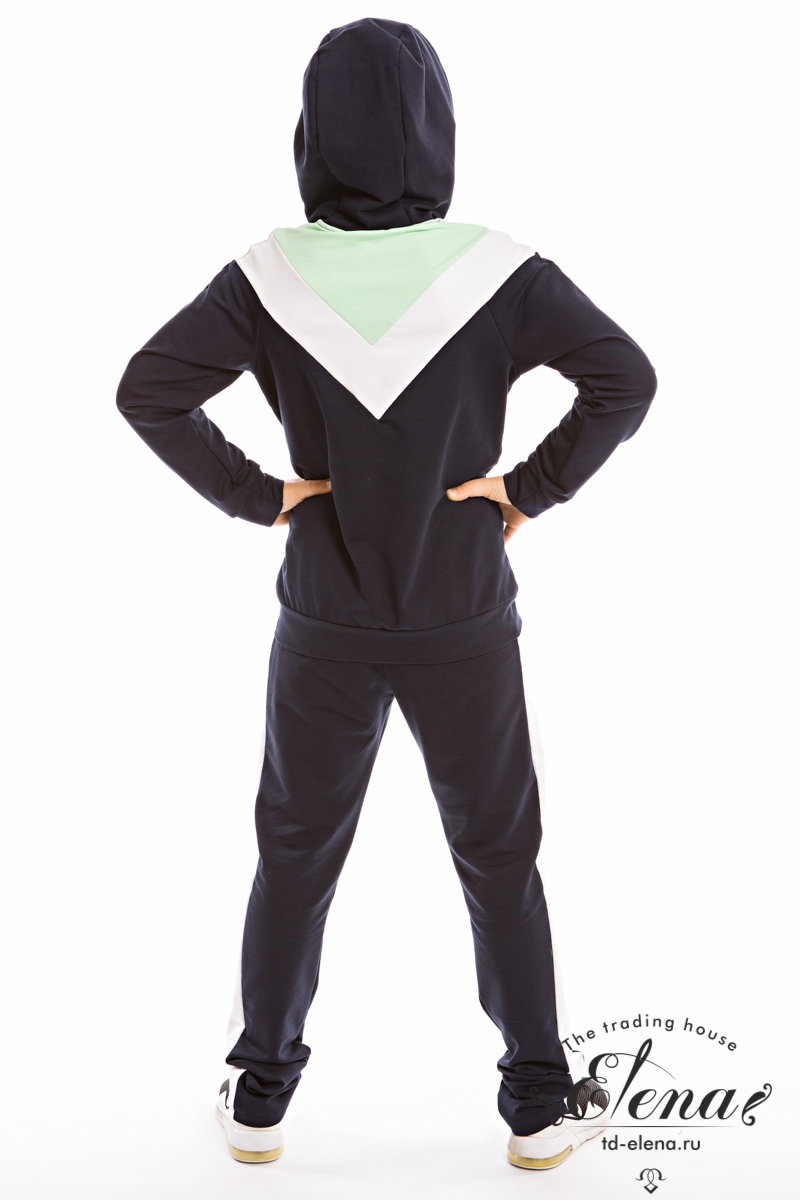 Костюм выполнен из футер петли с лайкрой, состоит из толстовки с капюшоном и застёжкой на молнию и зауженных брюк. На толстовке и брюках есть карманы и вставки из отделочного полотна.