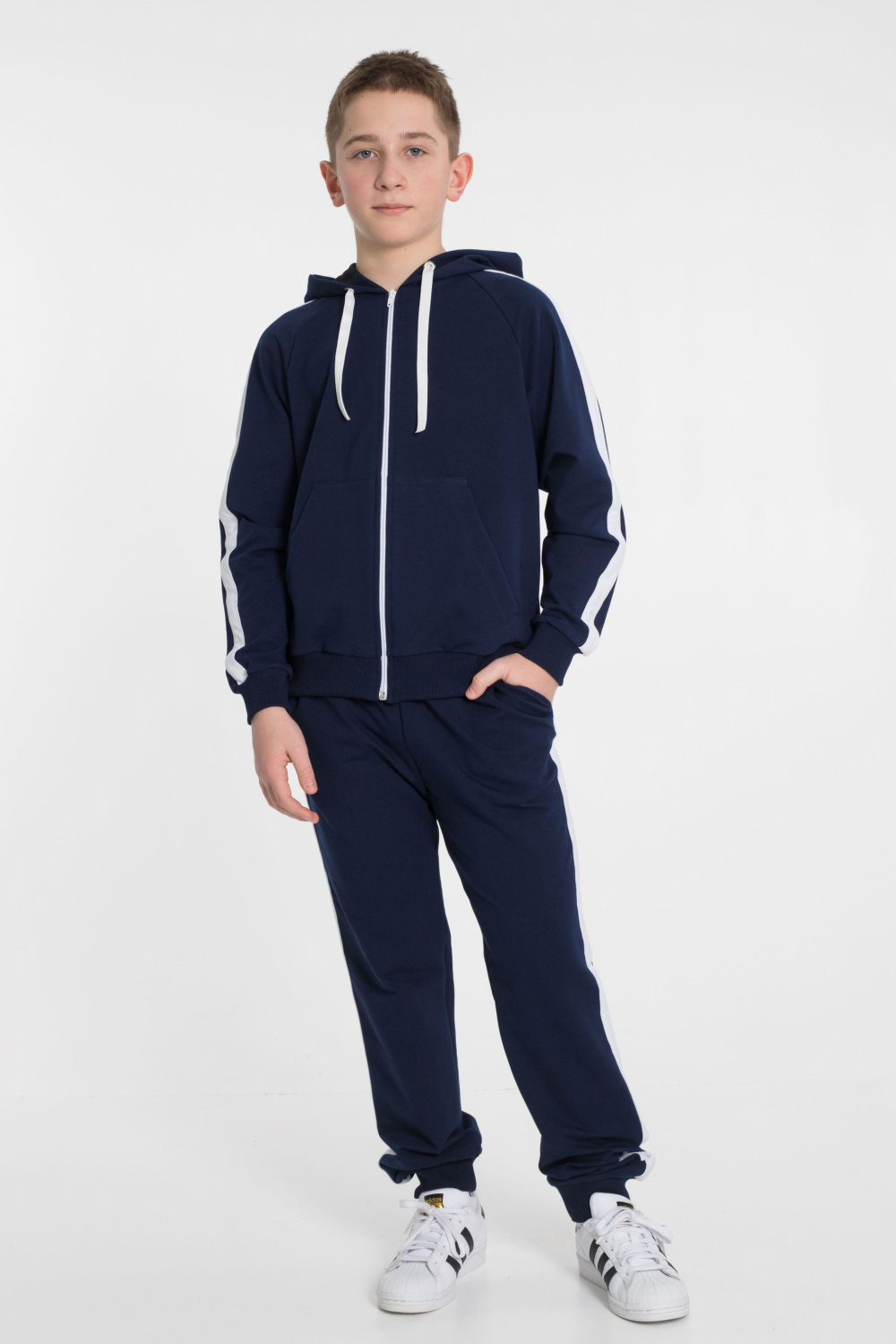 На рукавах толстовки и по бокам брюк широкие лампасы.